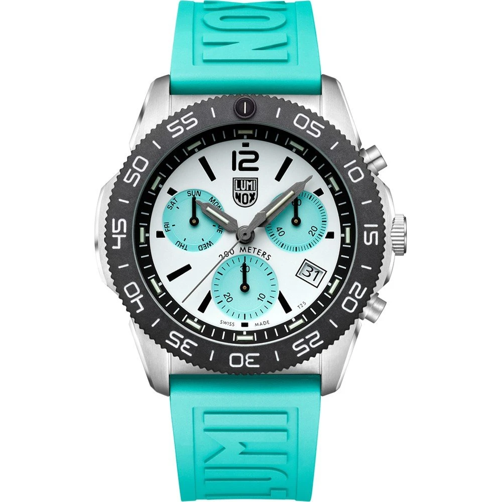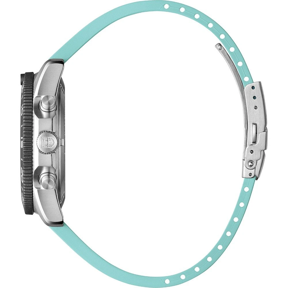 This Luminox watch has a case made of stainless steel with a diameter of 44 mm and is fitted with a rubber band. Inside the case lies a Ronda movement and the watch features a Single anti-reflective sapphire crystal.