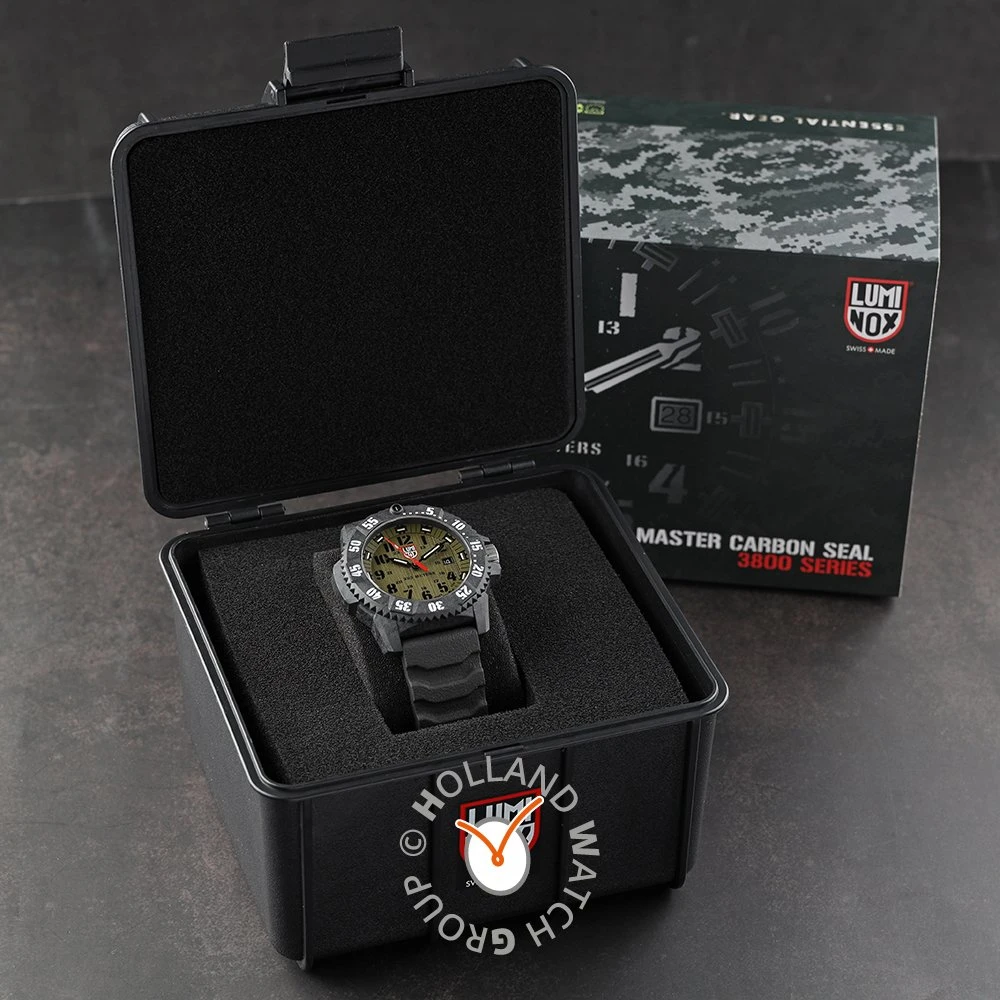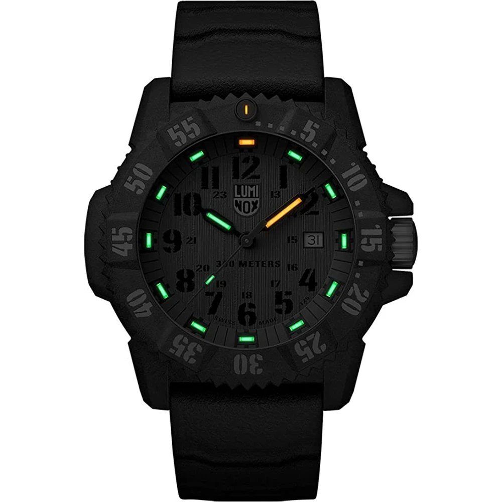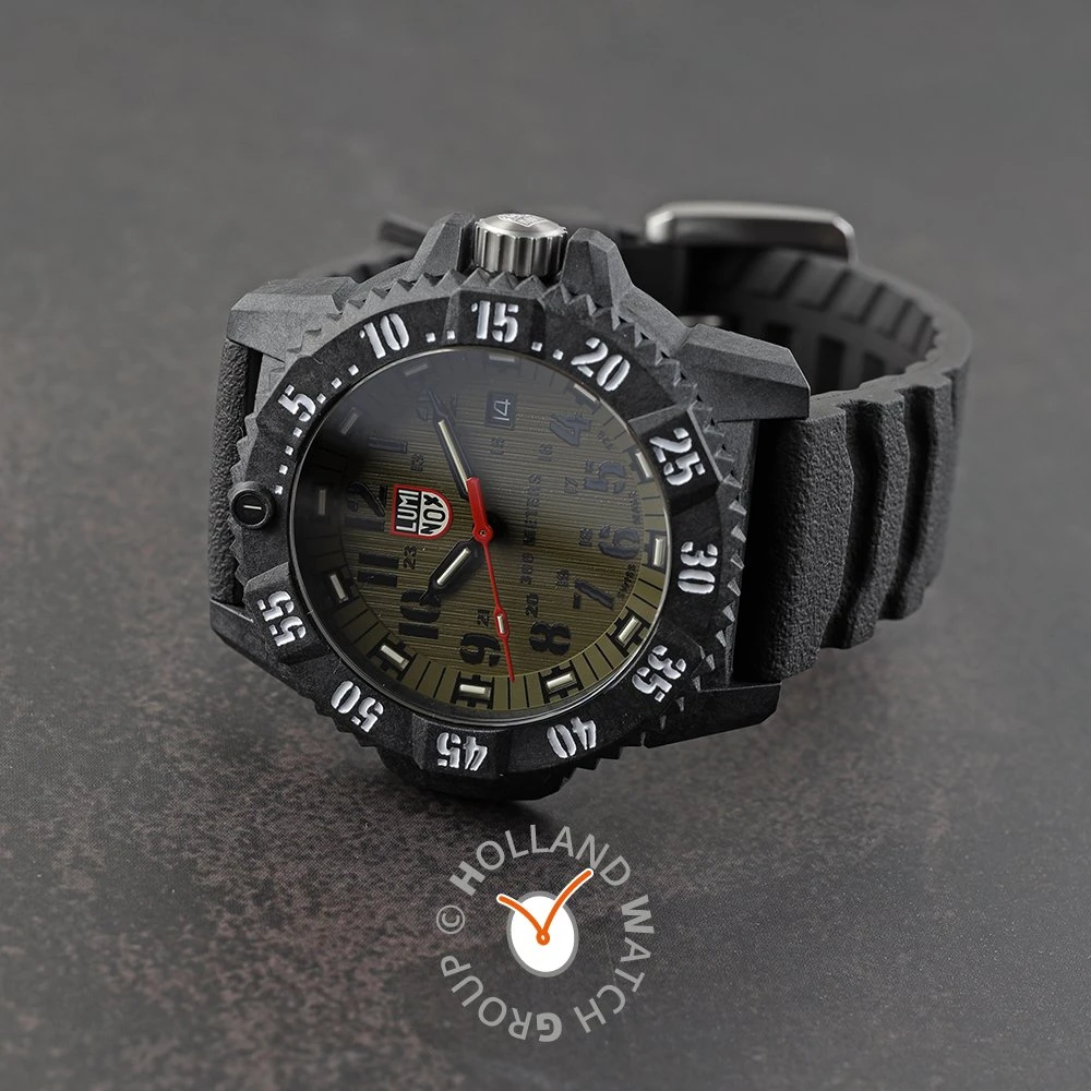 This Luminox watch has a carbon case 46 mm in diameter and is fitted with a rubber strap. Inside the case lies a Ronda movement and the watch features a Single anti-reflective sapphire crystal.