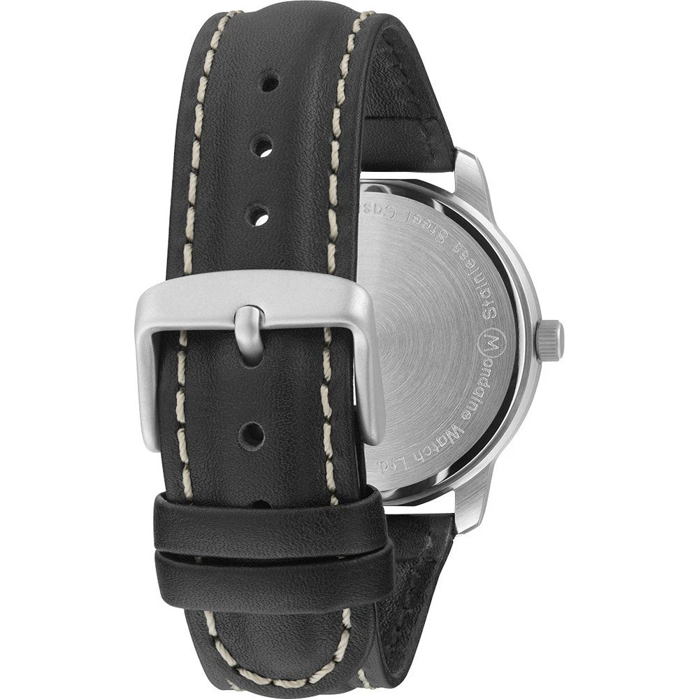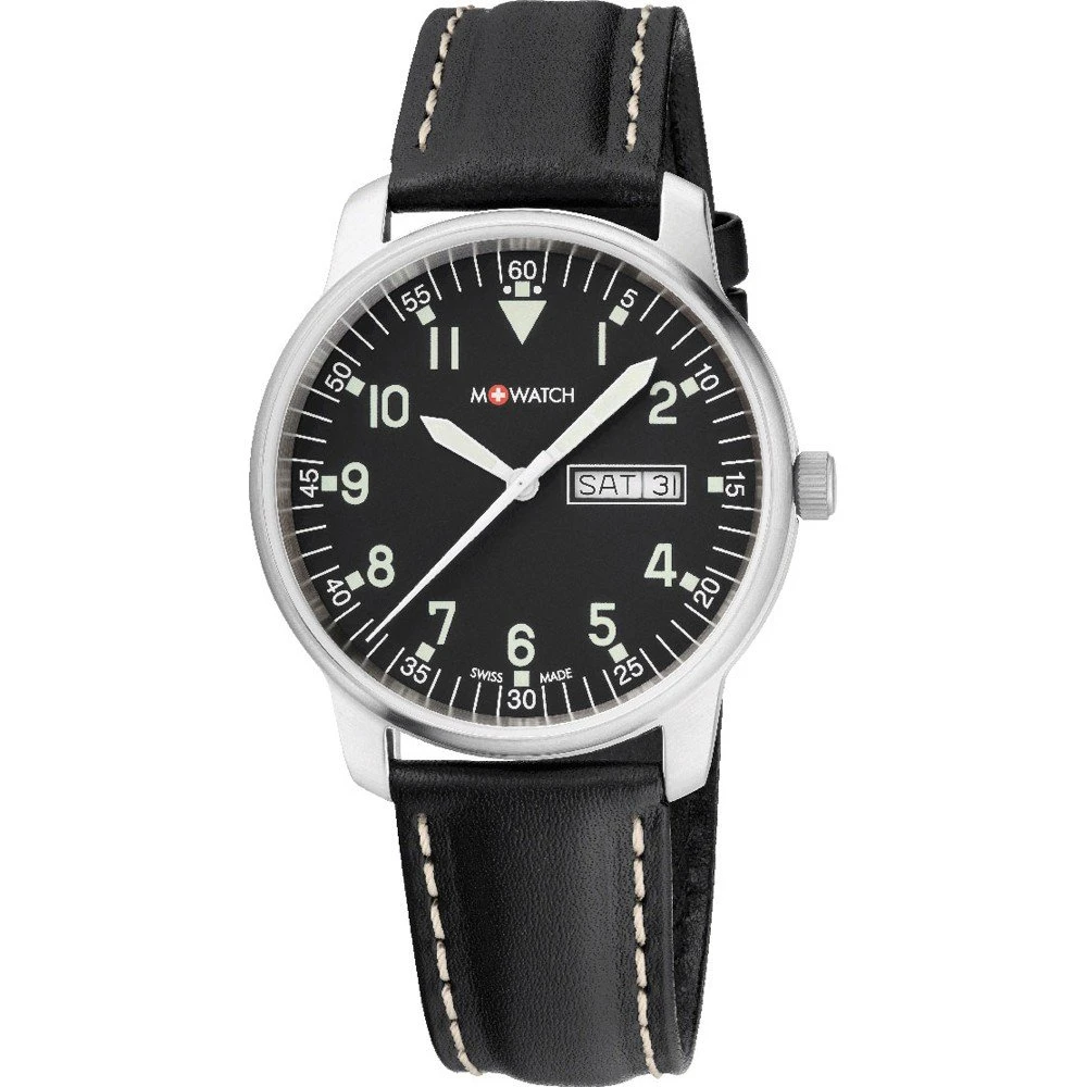 This M-Watch by Mondaine watch has a case made of stainless steel with a diameter of 40 mm and is fitted with a leather band. Inside the case lies a Ronda movement and the watch features a Hardened mineral crystal.
