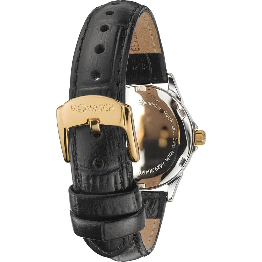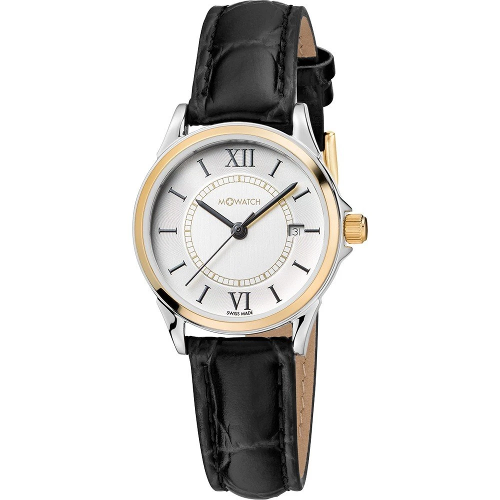 This M-Watch by Mondaine watch has a case made of stainless steel with a diameter of 28 mm and is fitted with a leather band. Inside the case lies a Ronda movement and the watch features a Hardened mineral crystal.