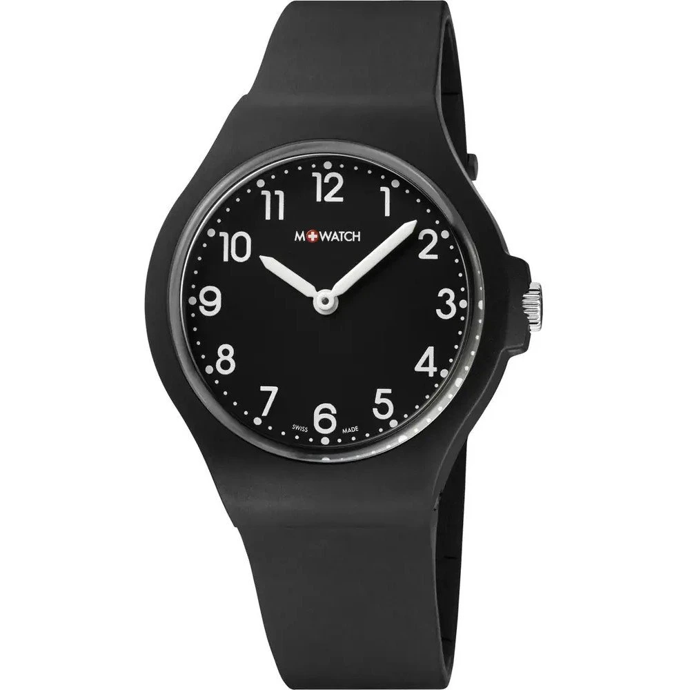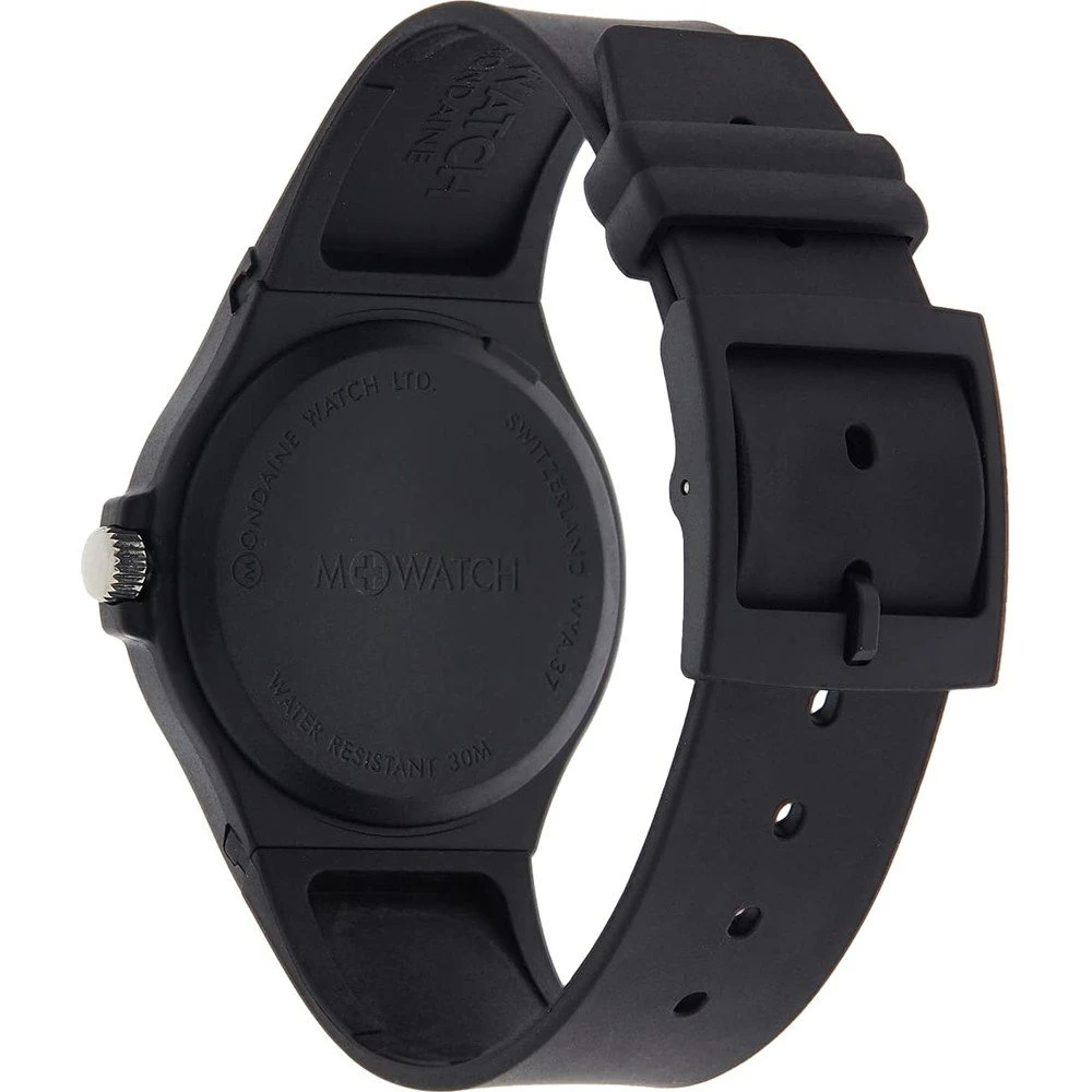 This M-Watch by Mondaine watch has a case made of Resin with a diameter of 37 mm and is fitted with a rubber band. Inside the case lies a Ronda movement and the watch features a Plexiglass crystal.