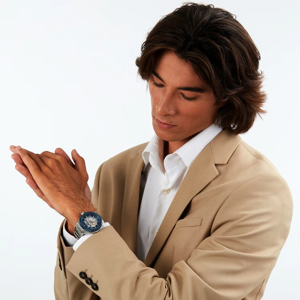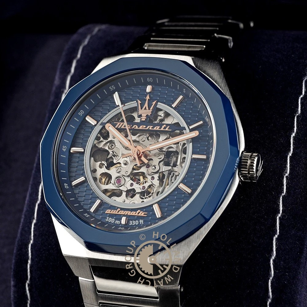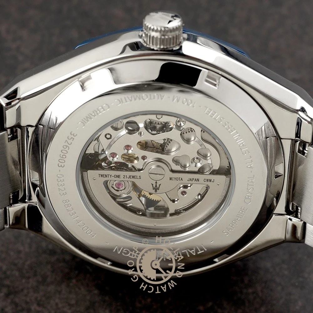 This Maserati watch has a case made of stainless steel with a diameter of 45 mm and is fitted with a metal band. Inside the case lies a Miyota movement and the watch features a Sapphire crystal.