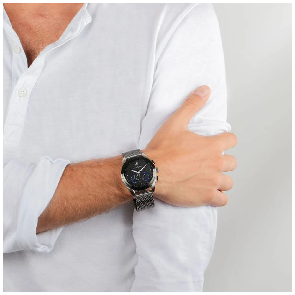This Maserati watch has a case made of stainless steel with a diameter of 45 mm and is fitted with a metal band. Inside the case lies a Miyota movement and the watch features a Mineral crystal.