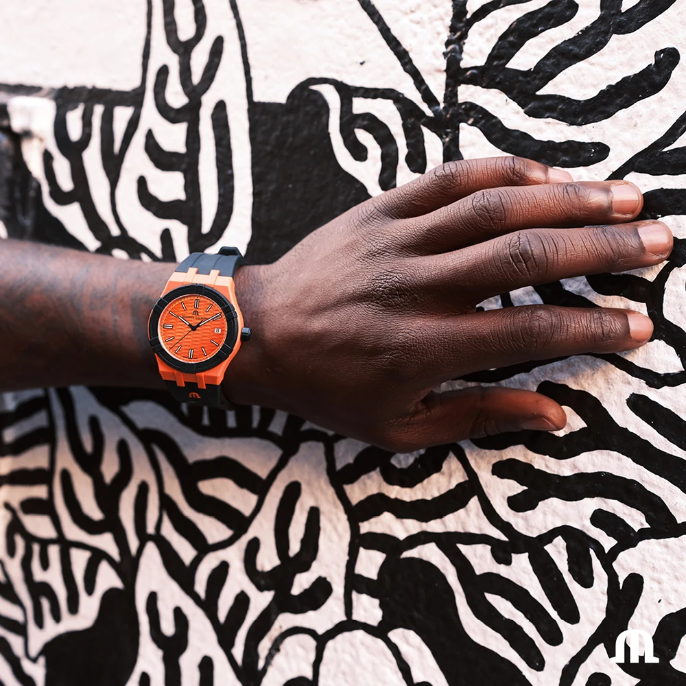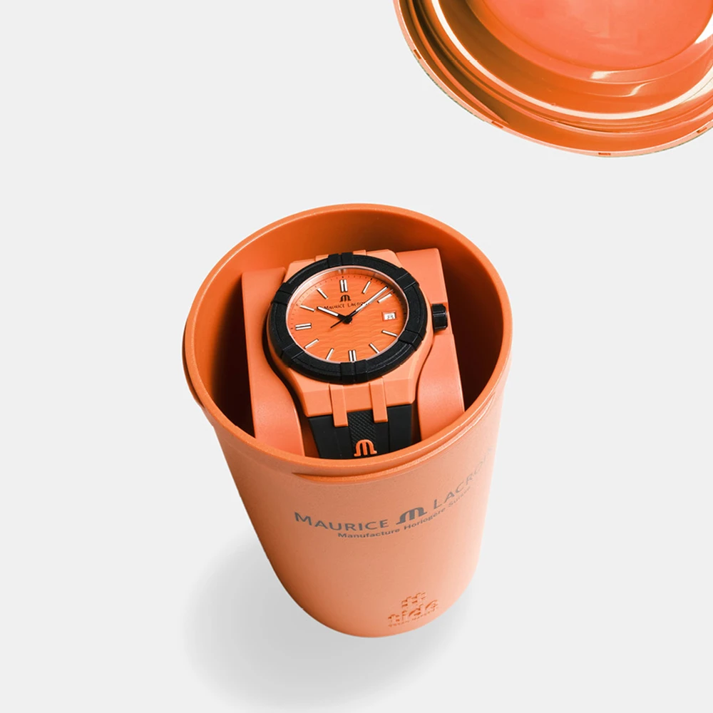 This Maurice Lacroix watch has a case made of Recycled plastic with a diameter of 40 mm and is fitted with a rubber band. Inside the case lies a Ronda movement and the watch features a Sapphire crystal.