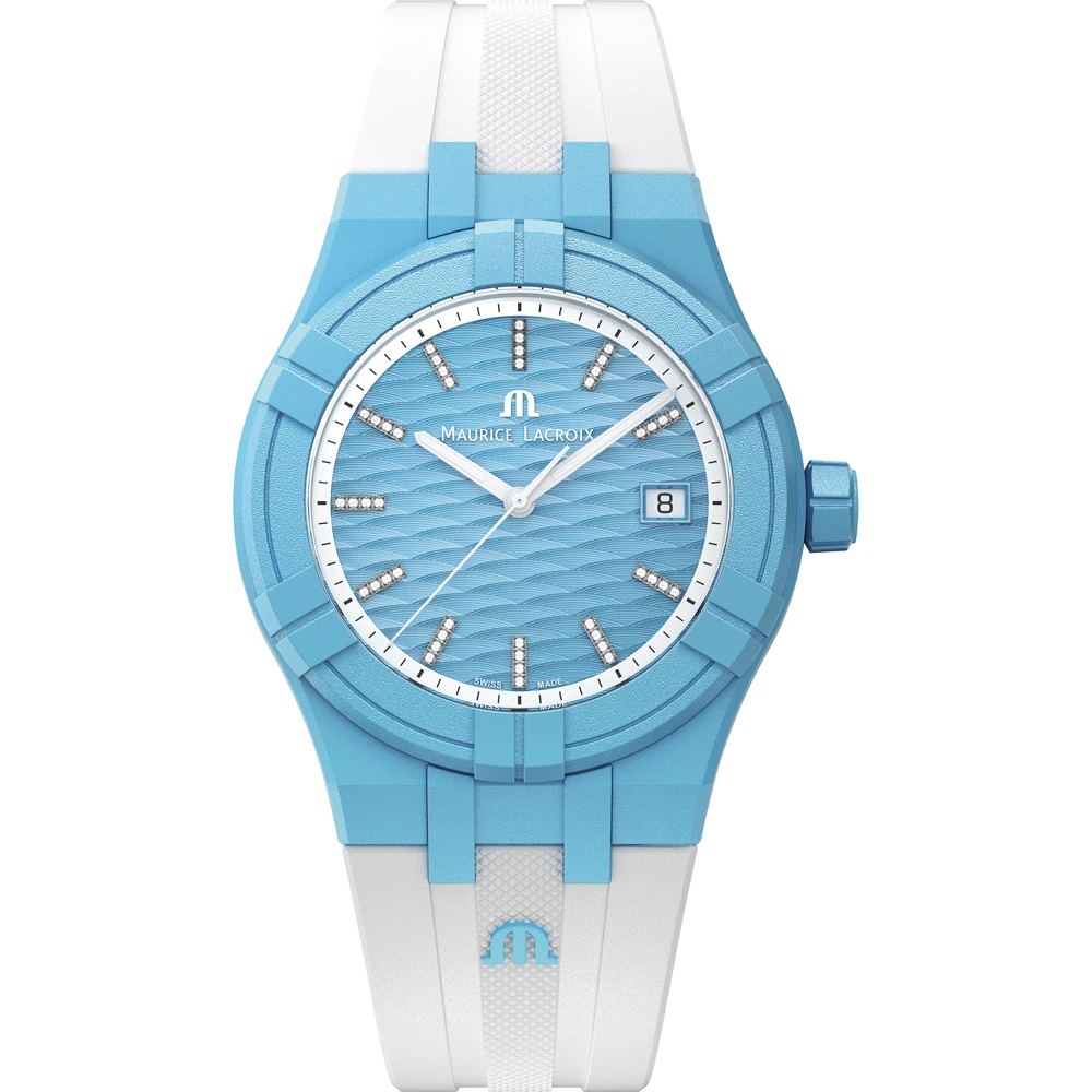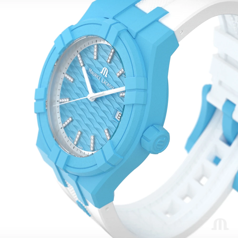 This Maurice Lacroix watch has a case made of Recycled plastic with a diameter of 40 mm and is fitted with a rubber band. Inside the case lies a Ronda movement and the watch features a Sapphire crystal.
