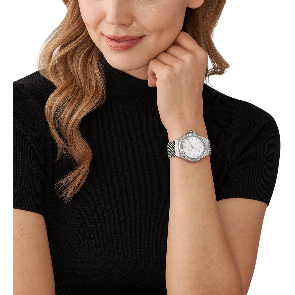 This Michael Kors watch has a case made of stainless steel with a diameter of 37 mm and is fitted with a stainless steel band. Inside the case lies a Miyota movement and the watch features a Mineral crystal.