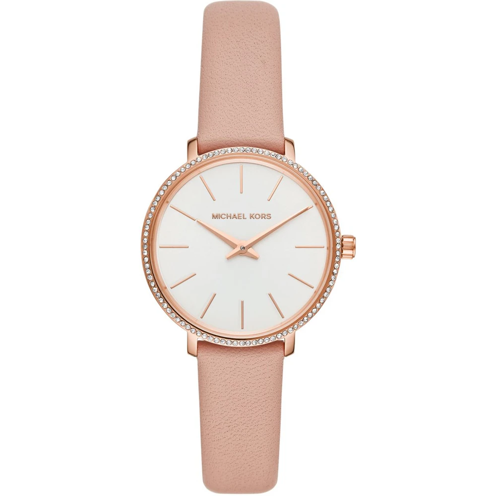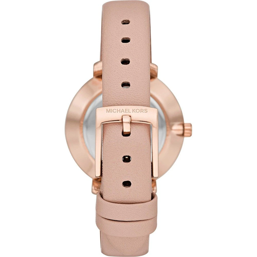 This Michael Kors watch has a case made of stainless steel with a diameter of 32 mm and is fitted with a leather band. Inside the case lies a Seiko Instruments Inc. movement and the watch features a Mineral crystal.