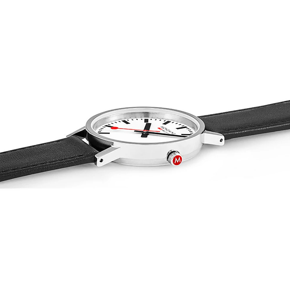 This Mondaine watch has a case made of stainless steel with a diameter of 36 mm and is fitted with a leather band. Inside the case lies a Ronda movement and the watch features a Hardened mineral crystal.