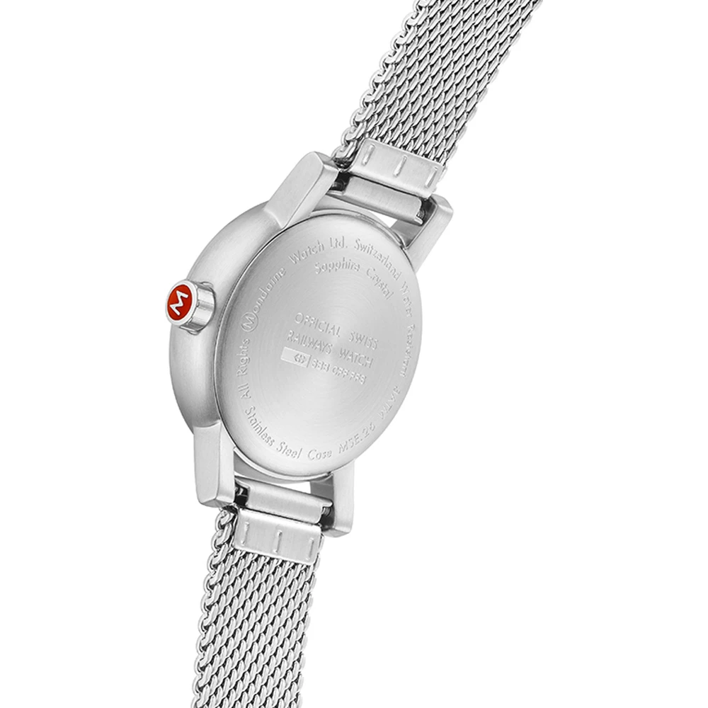 This Mondaine watch has a case made of stainless steel with a diameter of 26 mm and is fitted with a metal band. Inside the case lies a Ronda movement and the watch features a Sapphire crystal.
