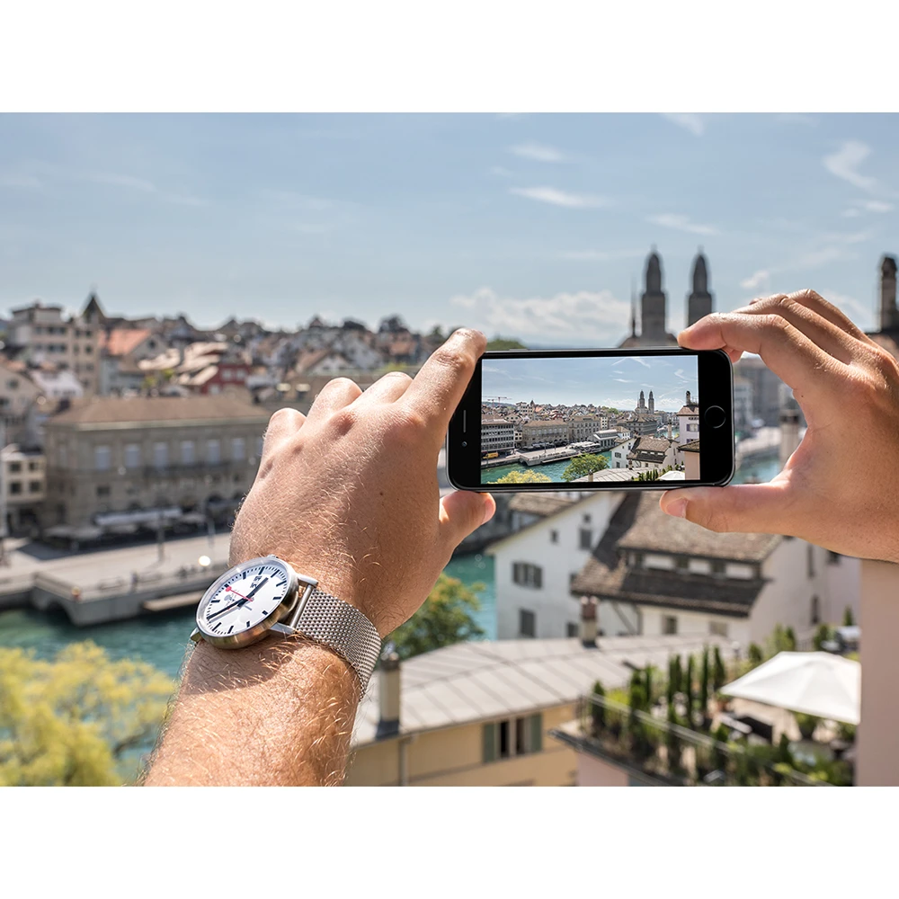 This Mondaine watch has a case made of stainless steel with a diameter of 40 mm and is fitted with a metal band. Inside the case lies a Ronda movement and the watch features a Sapphire crystal.