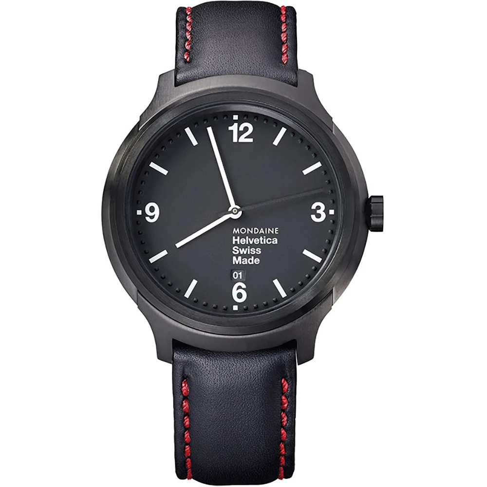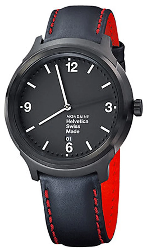 This Mondaine watch has a case made of stainless steel with a diameter of 43 mm and is fitted with a leather band. Inside the case lies a Ronda movement and the watch features a Sapphire crystal.