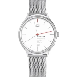 This Mondaine watch has a case made of stainless steel with a diameter of 38 mm and is fitted with a metal band. Inside the case lies a Ronda movement and the watch features a Sapphire crystal.