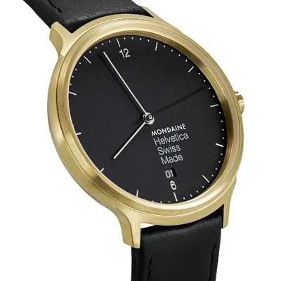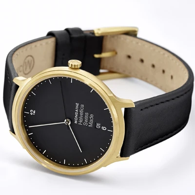 This Mondaine watch has a case made of stainless steel with a diameter of 38 mm and is fitted with a leather band. Inside the case lies a Ronda movement and the watch features a Sapphire crystal.