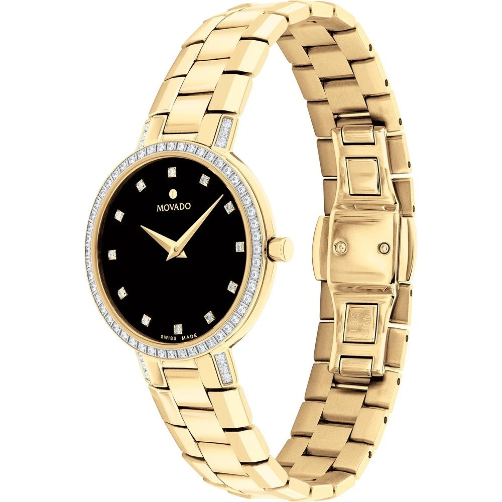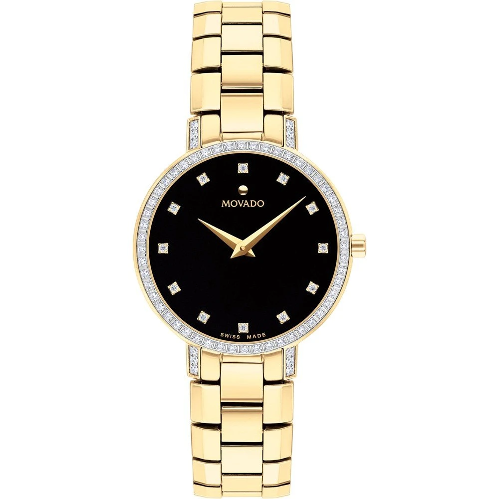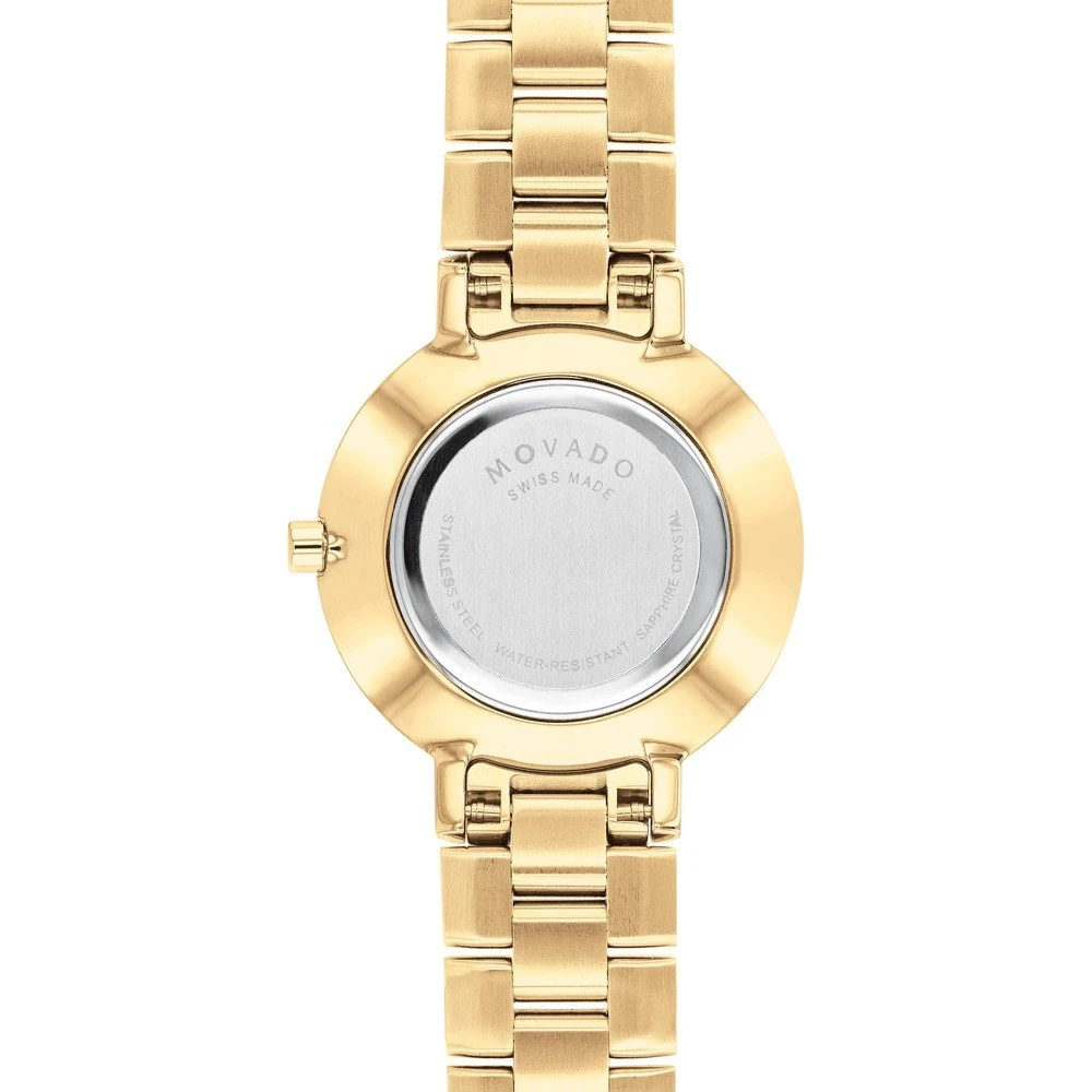 This Movado watch has a case made of stainless steel with a diameter of 28 mm and is fitted with a metal band. Inside the case lies a ETA movement and the watch features a Sapphire crystal.
