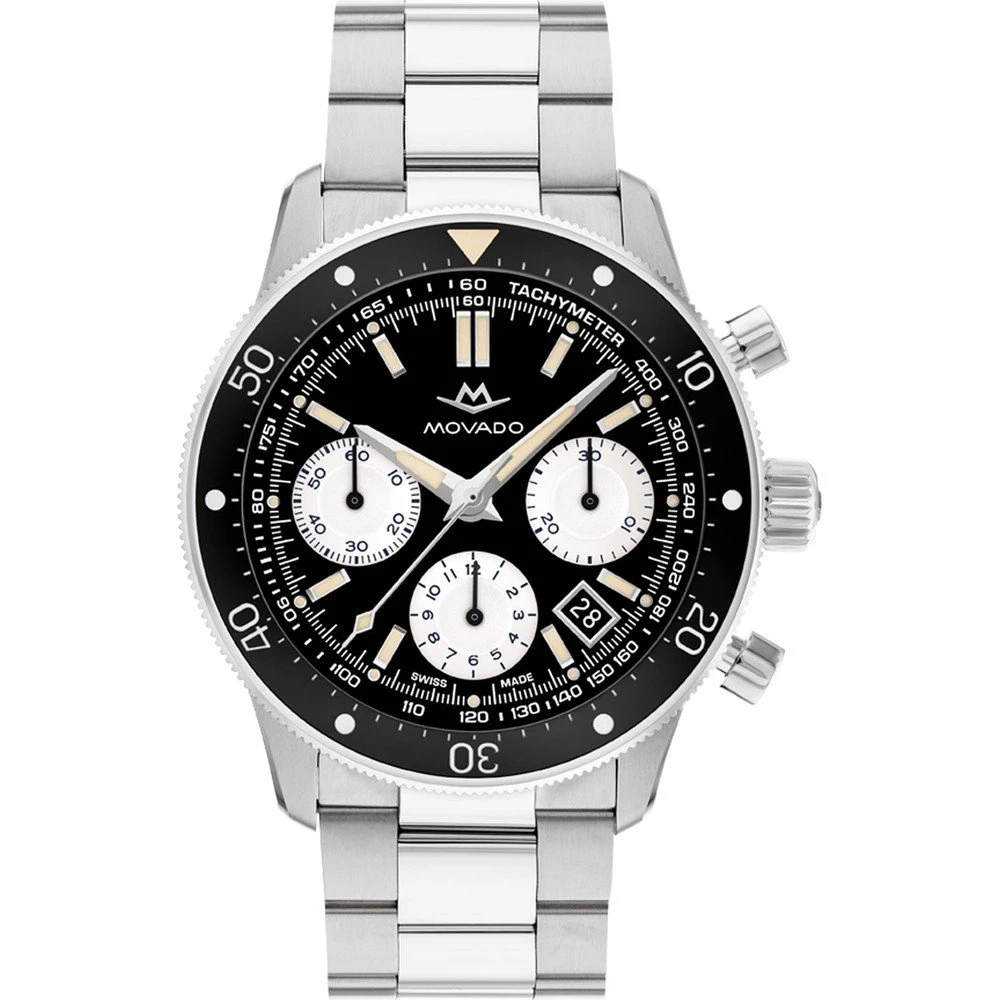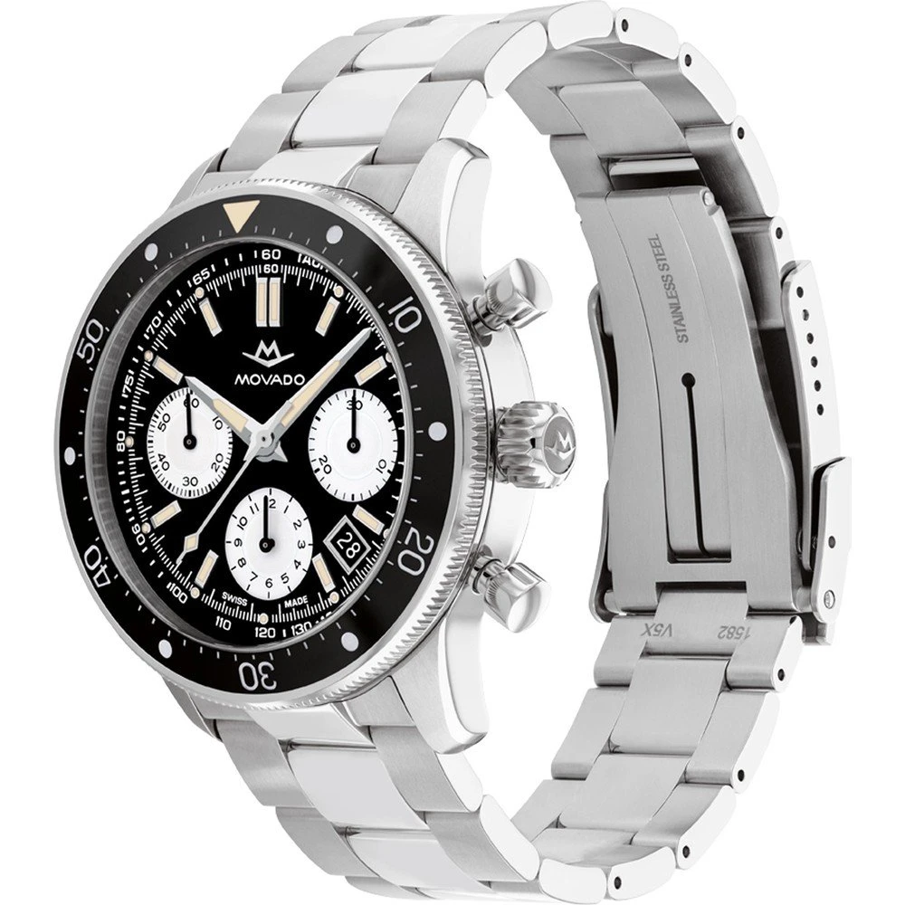 This Movado watch has a stainless steel case 46 mm in diameter and is fitted with a metal strap.
