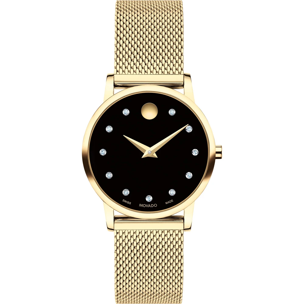 This Movado watch has a case made of stainless steel with a diameter of 28 mm and is fitted with a metal band. Inside the case lies a ETA movement and the watch features a Sapphire crystal.