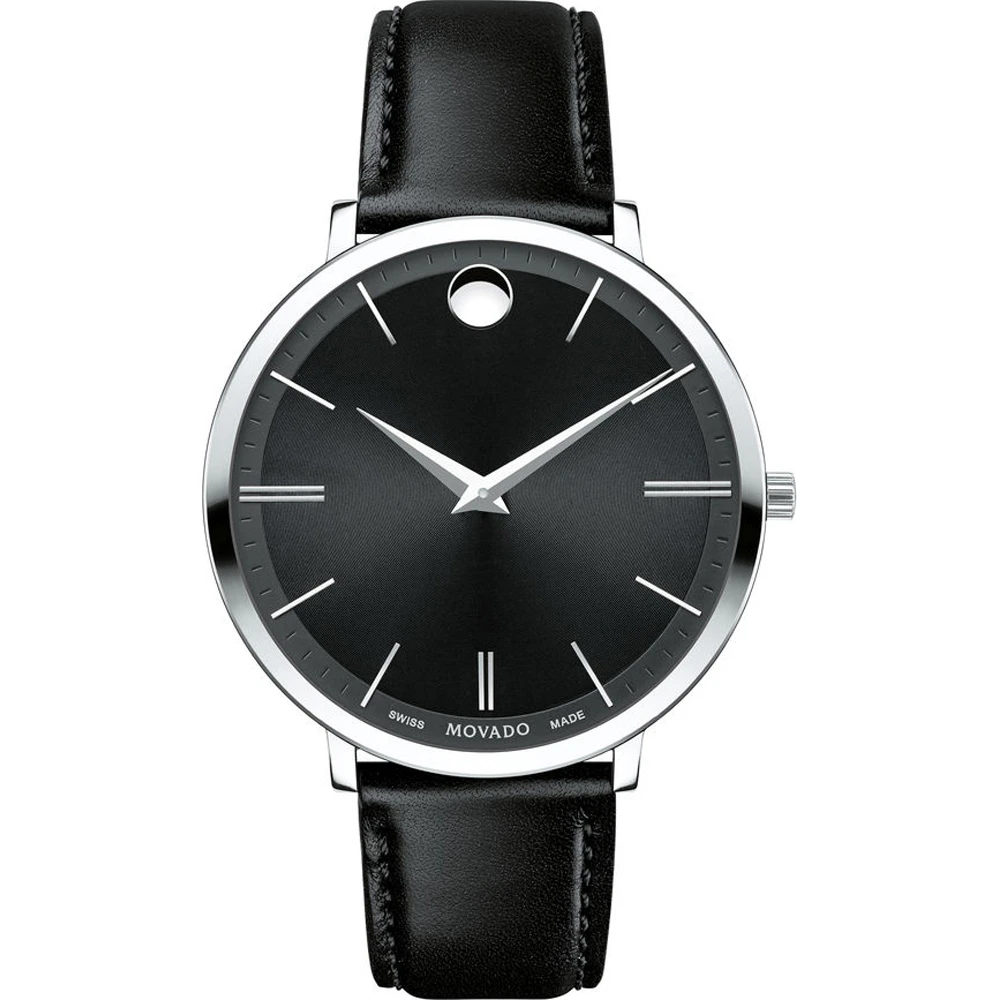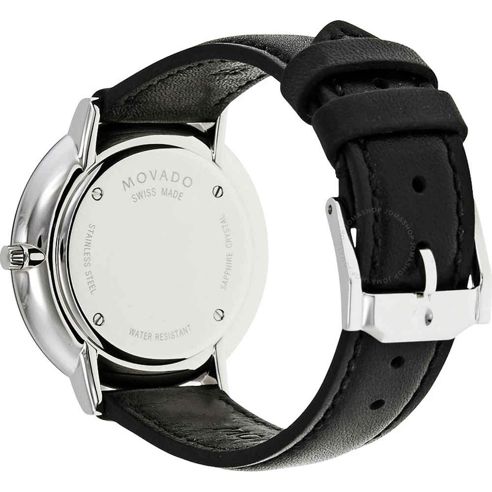 This Movado watch has a case made of stainless steel with a diameter of 35 mm and is fitted with a leather band. Inside the case lies a ETA movement and the watch features a Sapphire crystal.