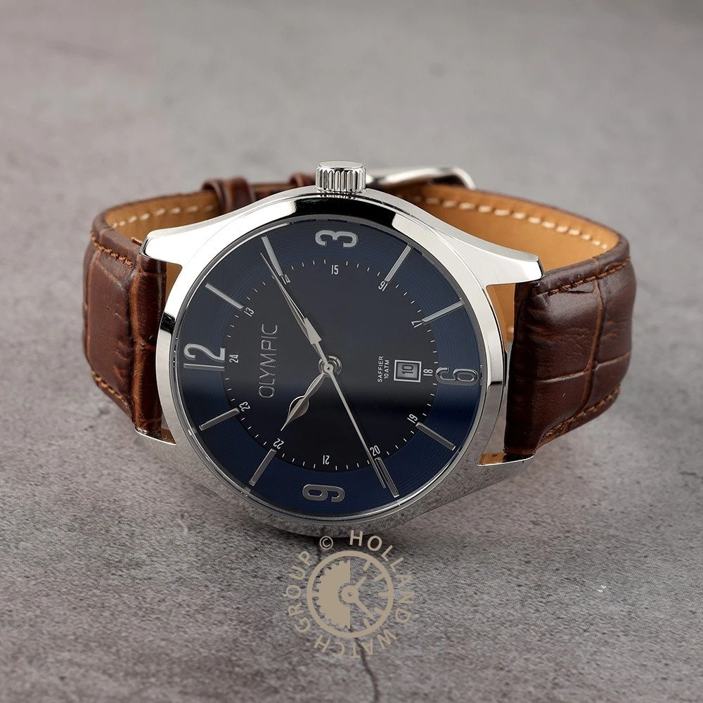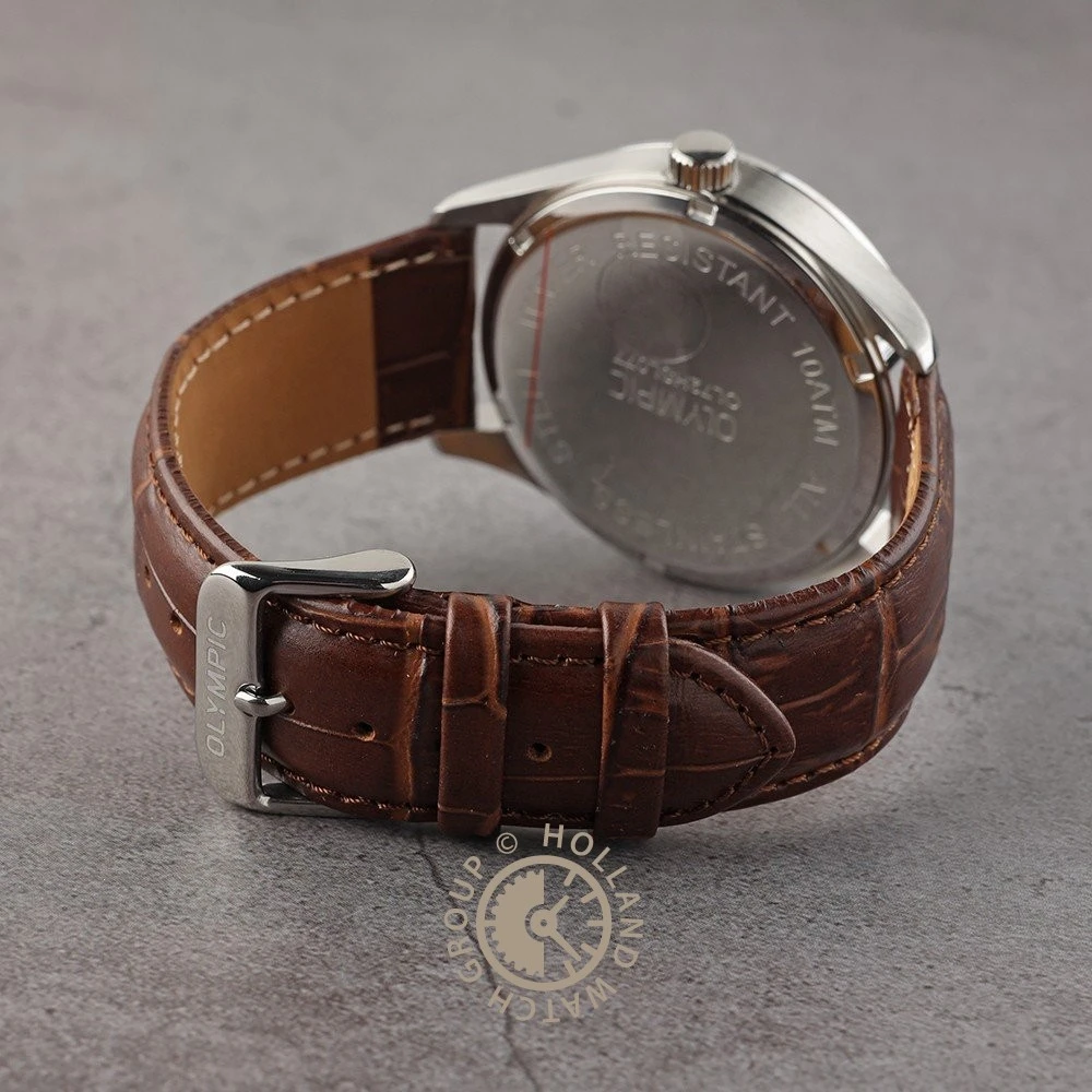 This Olympic watch has a case made of stainless steel with a diameter of 42 mm and is fitted with a leather band. Inside the case lies a Miyota movement and the watch features a Sapphire crystal.