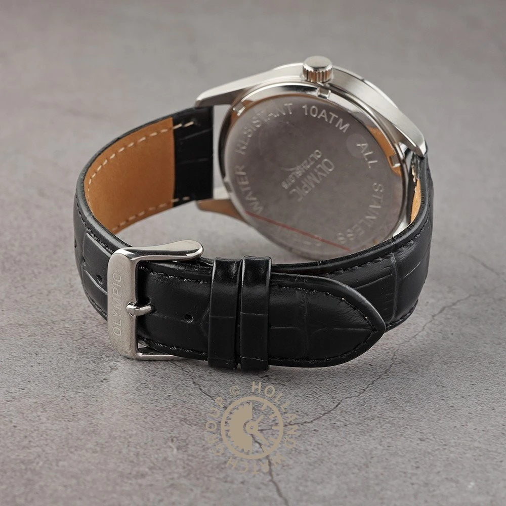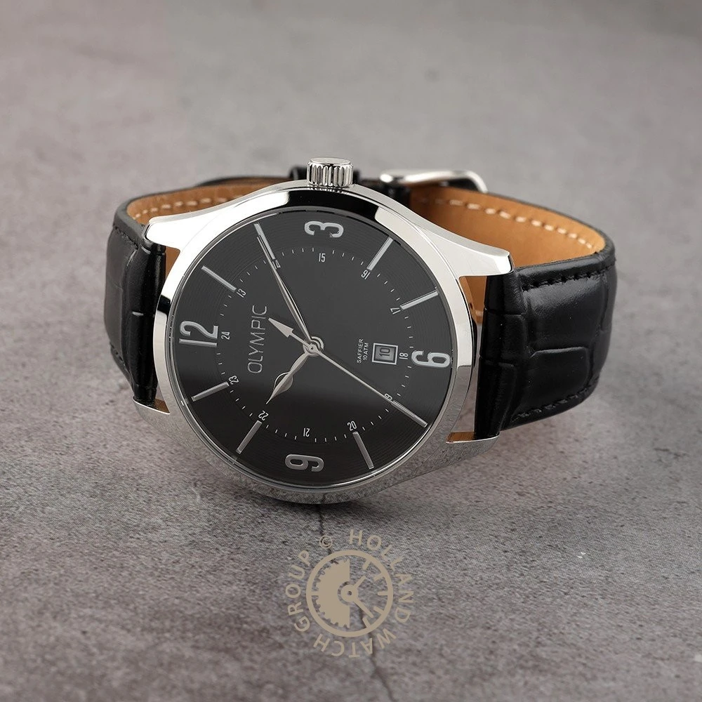 This Olympic watch has a case made of stainless steel with a diameter of 42 mm and is fitted with a leather band. Inside the case lies a Miyota movement and the watch features a Sapphire crystal.