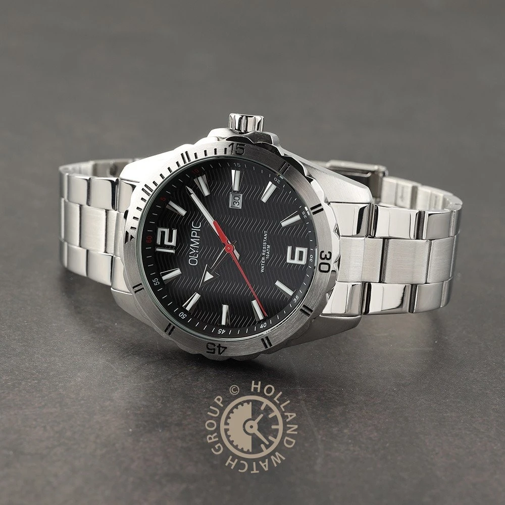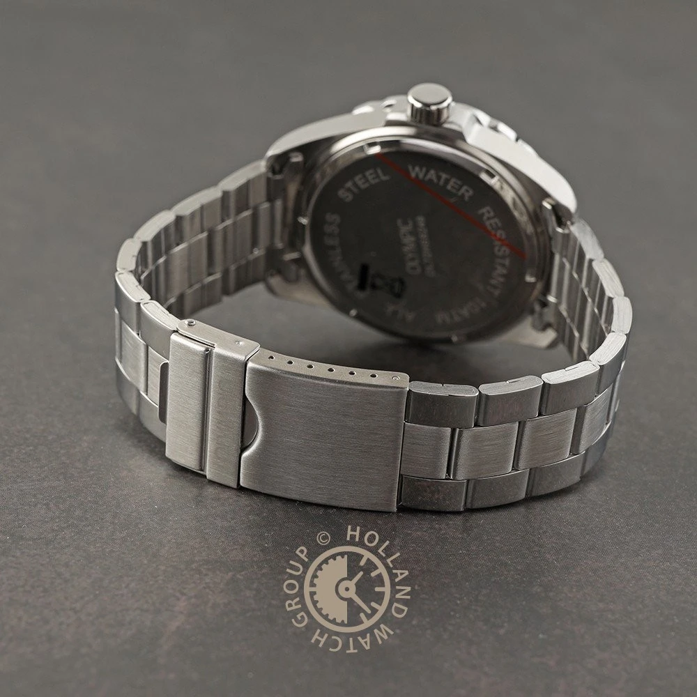 This Olympic watch has a case made of stainless steel with a diameter of 44 mm and is fitted with a metal band. Inside the case lies a Miyota movement and the watch features a Mineral crystal.
