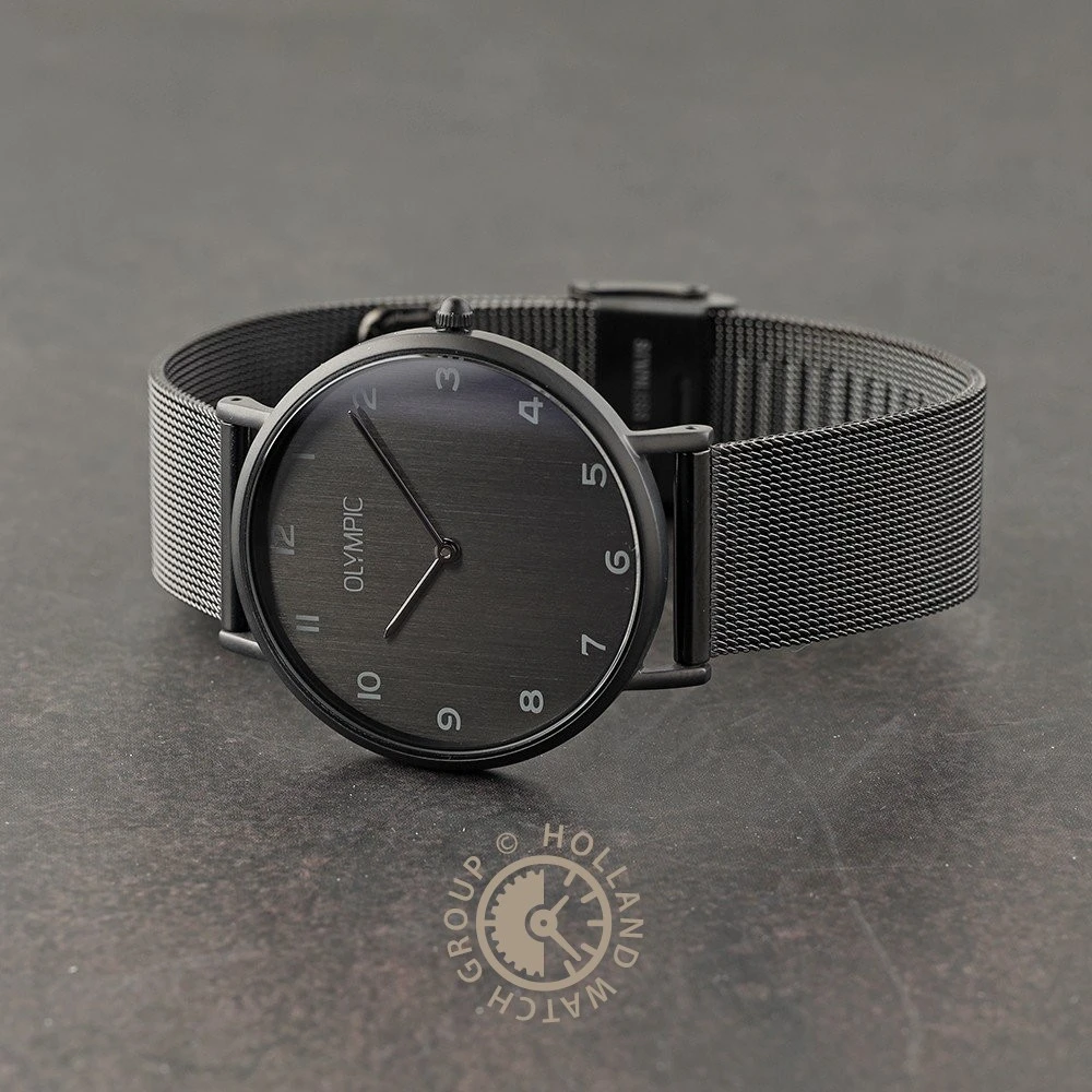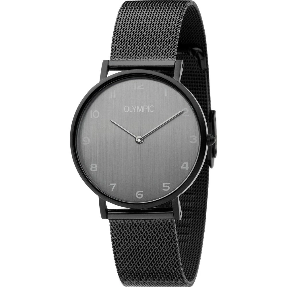 This Olympic watch has a case made of stainless steel with a diameter of 36 mm and is fitted with a metal band. Inside the case lies a Miyota movement and the watch features a Mineral crystal.