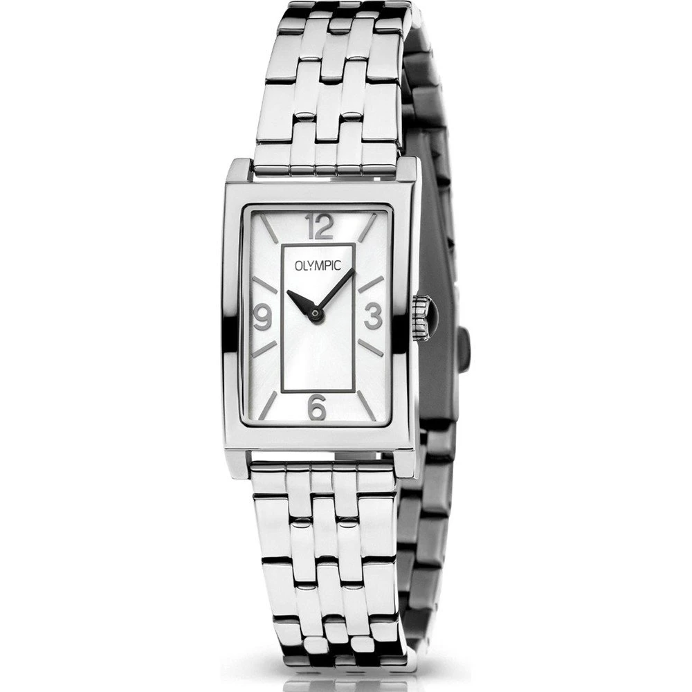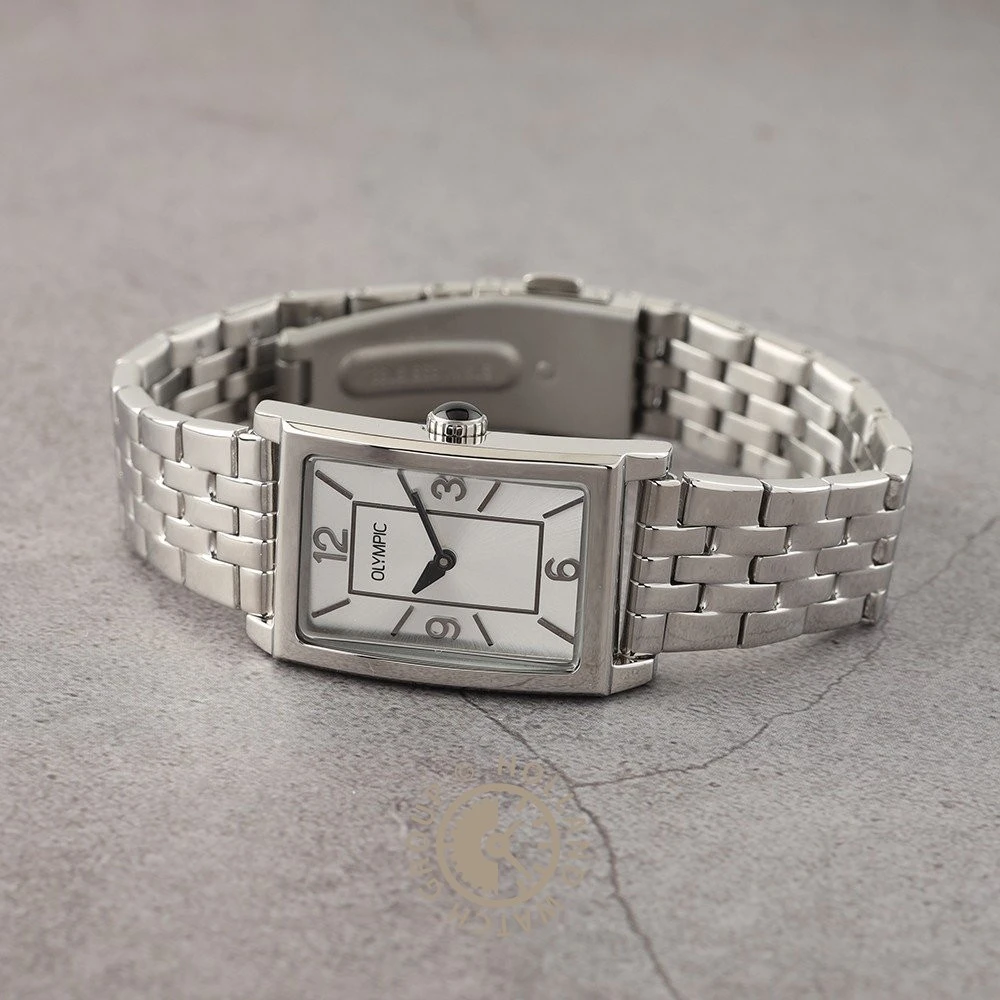 This Olympic watch has a case made of stainless steel with a diameter of 21 mm and is fitted with a metal band. Inside the case lies a Miyota movement and the watch features a Mineral crystal.