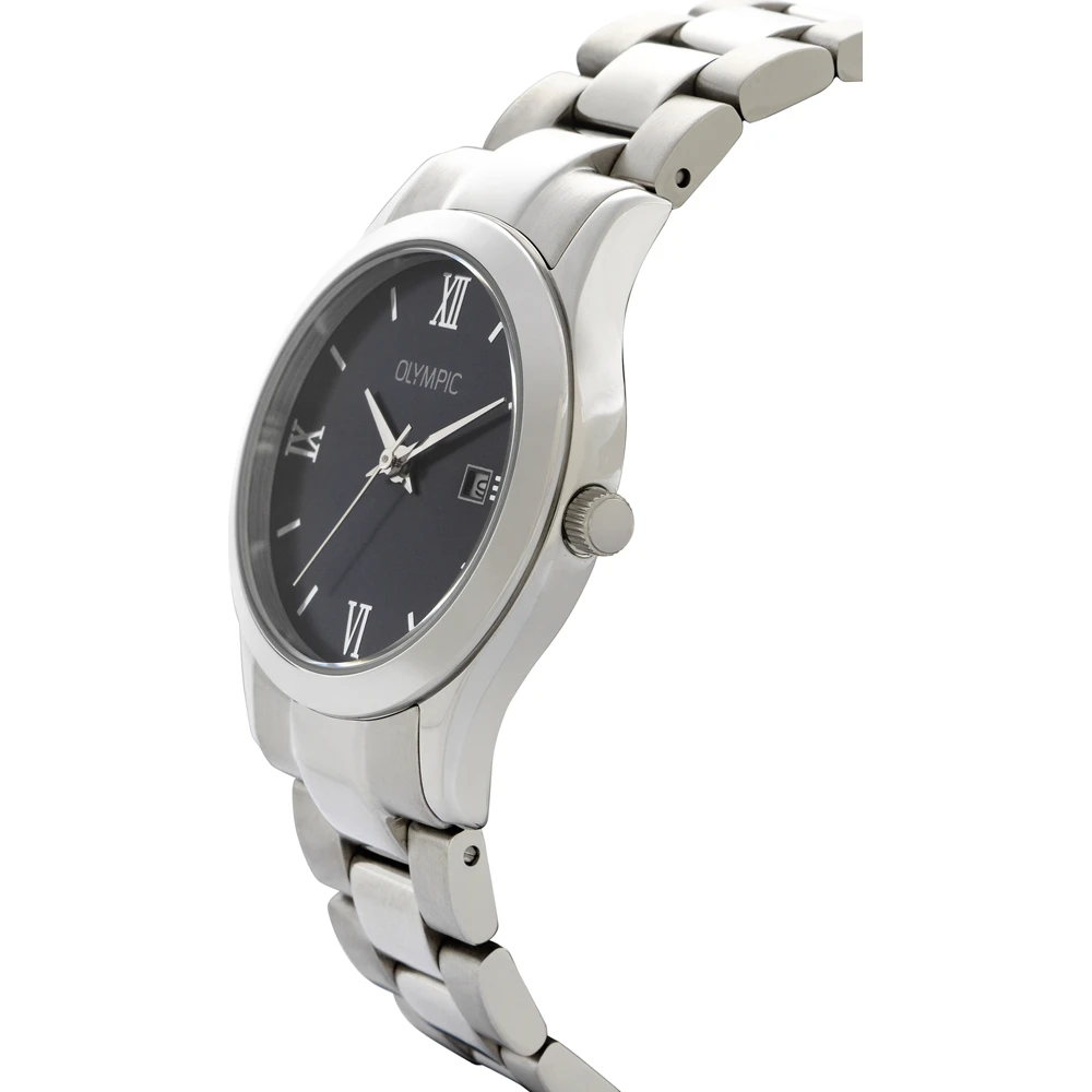 This Olympic watch has a case made of stainless steel with a diameter of 30 mm and is fitted with a metal band. Inside the case lies a Miyota movement and the watch features a Mineral crystal.