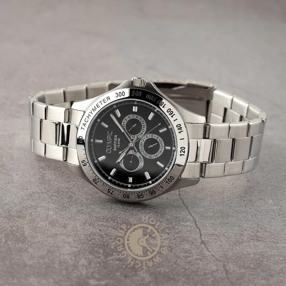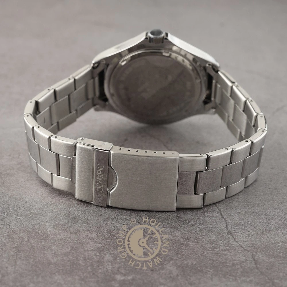 This Olympic watch has a case made of stainless steel with a diameter of 42 mm and is fitted with a metal band. Inside the case lies a Seiko Instruments Inc. movement and the watch features a Sapphire crystal.