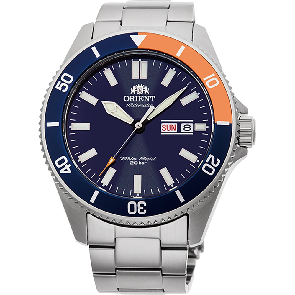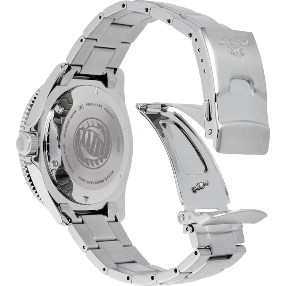 This Orient watch has a case made of stainless steel with a diameter of 44 mm and is fitted with a metal band. Inside the case lies a Orient movement and the watch features a Mineral crystal.
