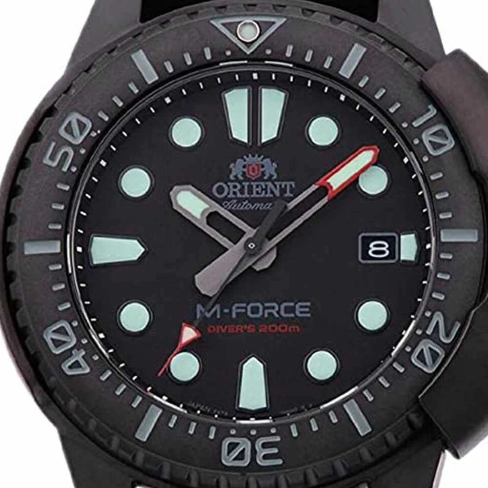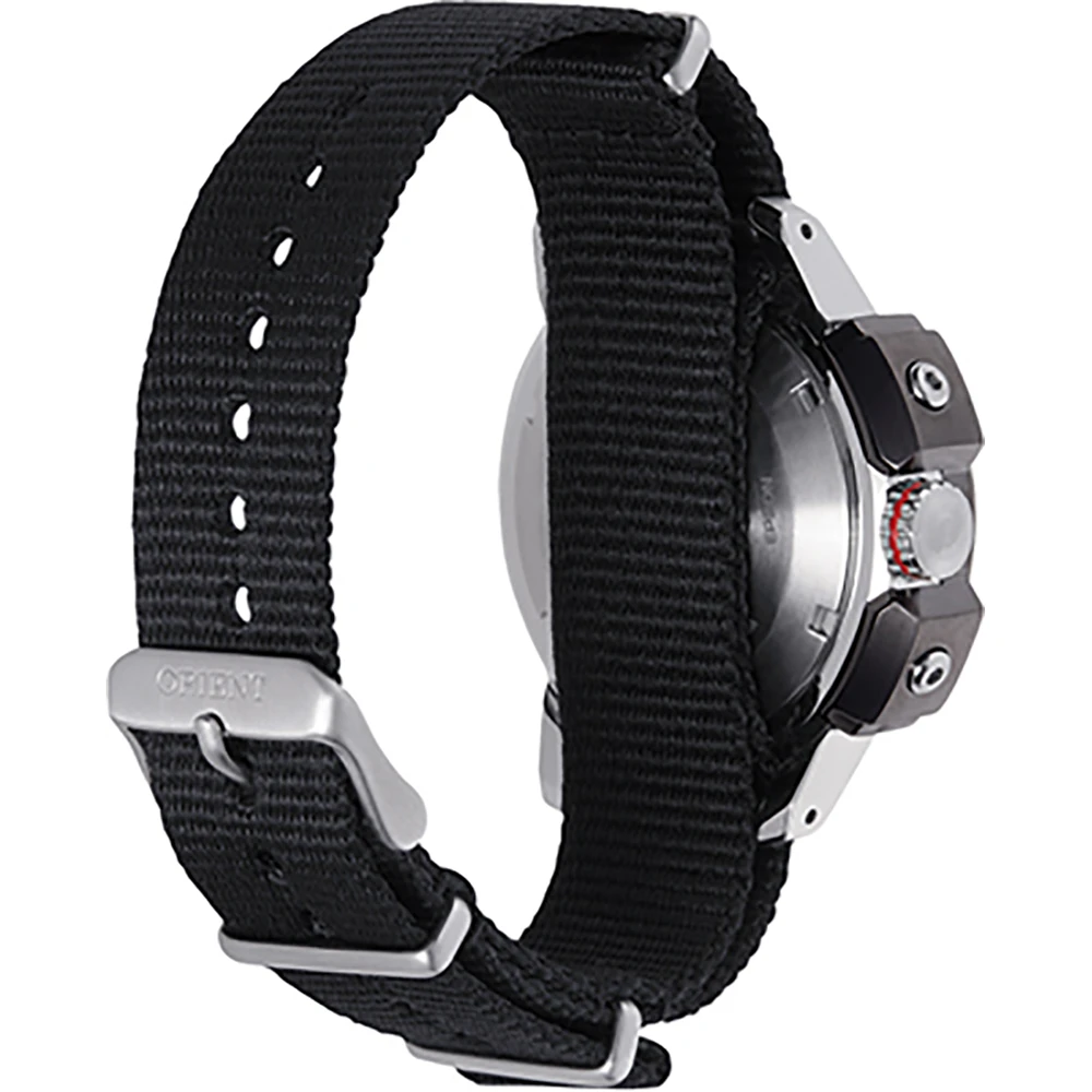 This Orient watch has a case made of stainless steel with a diameter of 45 mm and is fitted with a textile band. Inside the case lies a Orient movement and the watch features a Single anti-reflective sapphire crystal.