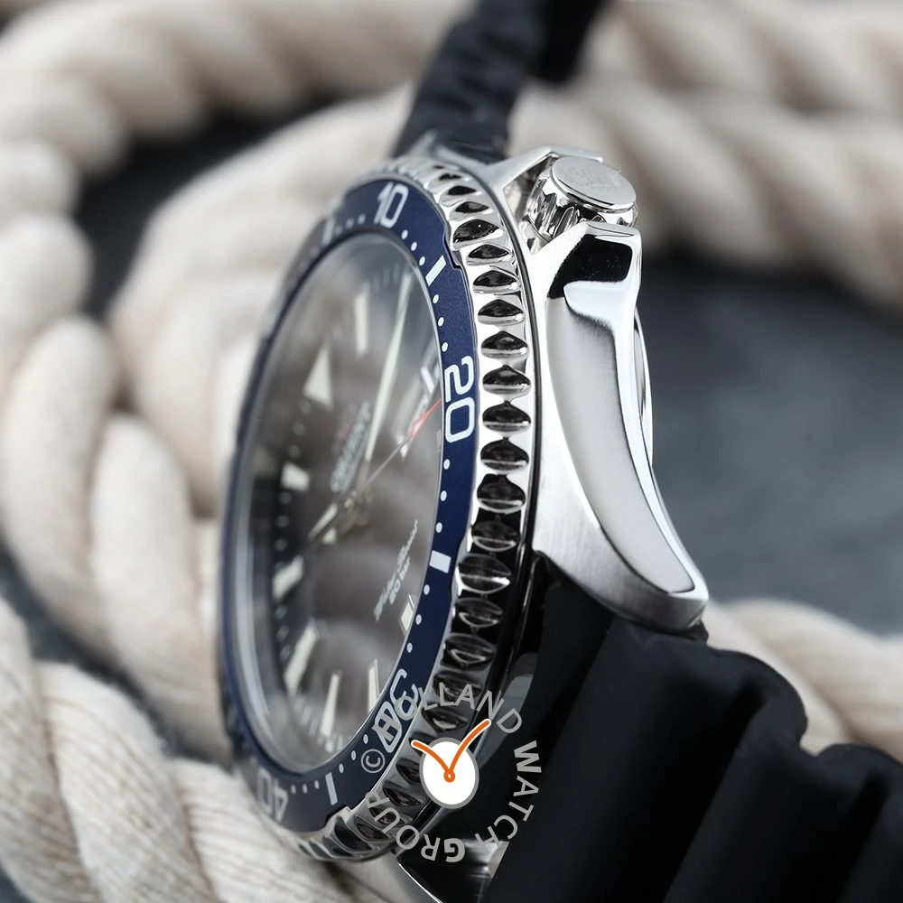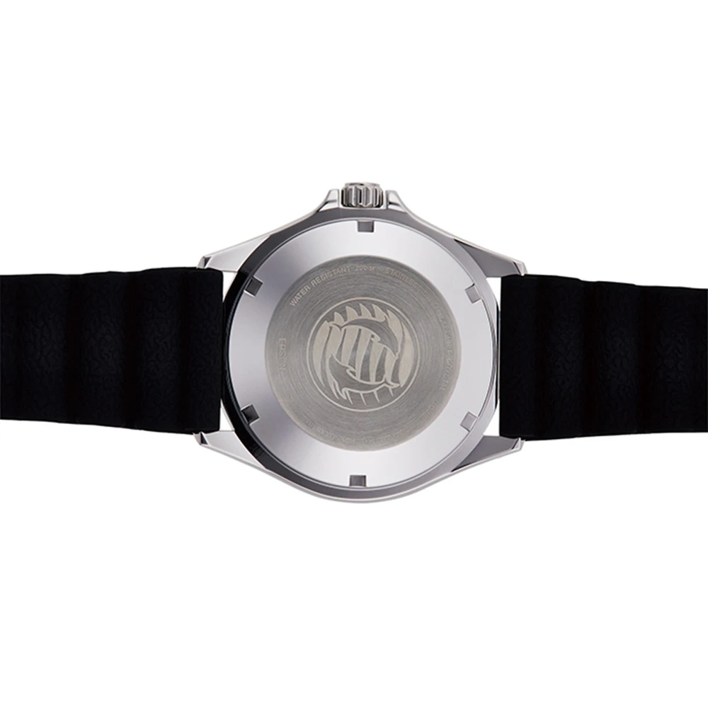 This Orient watch has a stainless steel case 42 mm in diameter and is fitted with a rubber strap. Inside the case lies a Orient movement and the watch features a Sapphire crystal.