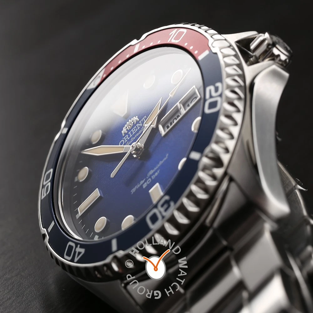 This Orient watch has a stainless steel case 41.8 mm in diameter and is fitted with a metal strap. Inside the case lies a Orient movement and the watch features a Sapphire crystal.