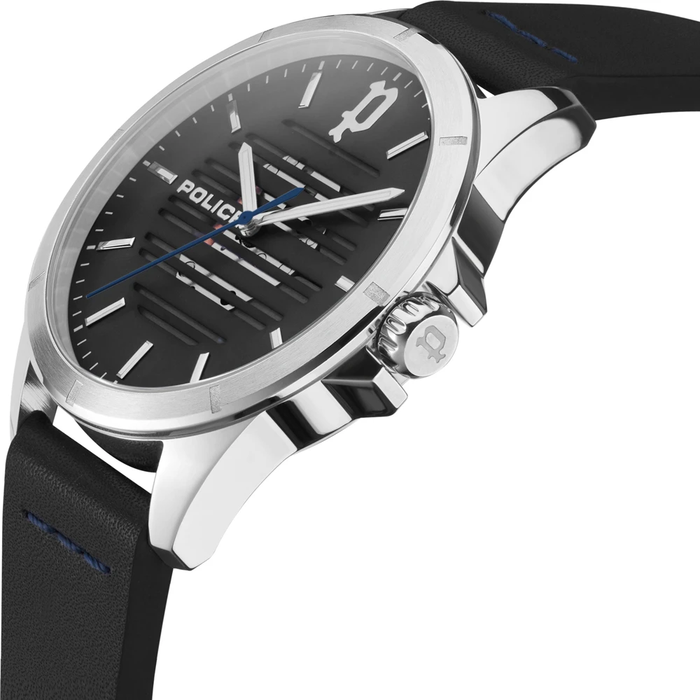 This Police watch has a case made of stainless steel with a diameter of 45 mm and is fitted with a leather band. Inside the case lies a Miyota movement and the watch features a Mineral crystal.