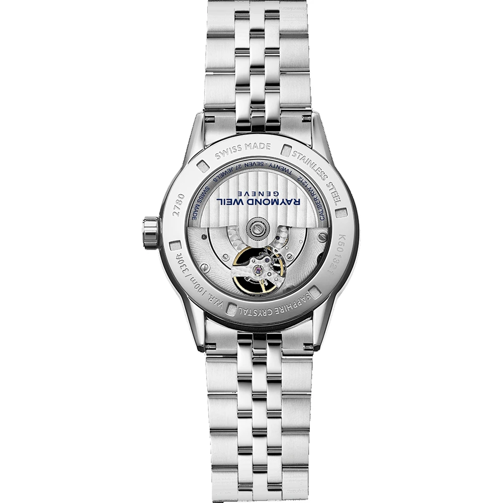 This Raymond Weil watch has a case made of stainless steel with a diameter of 42 mm and is fitted with a metal band. Inside the case lies a Sellita movement and the watch features a Sapphire crystal.