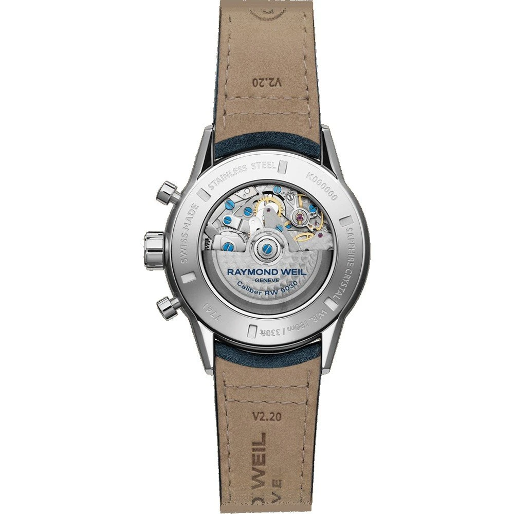 This Raymond Weil watch has a case made of stainless steel with a diameter of 43.5 mm and is fitted with a leather band. Inside the case lies a Sellita movement and the watch features a Sapphire crystal.