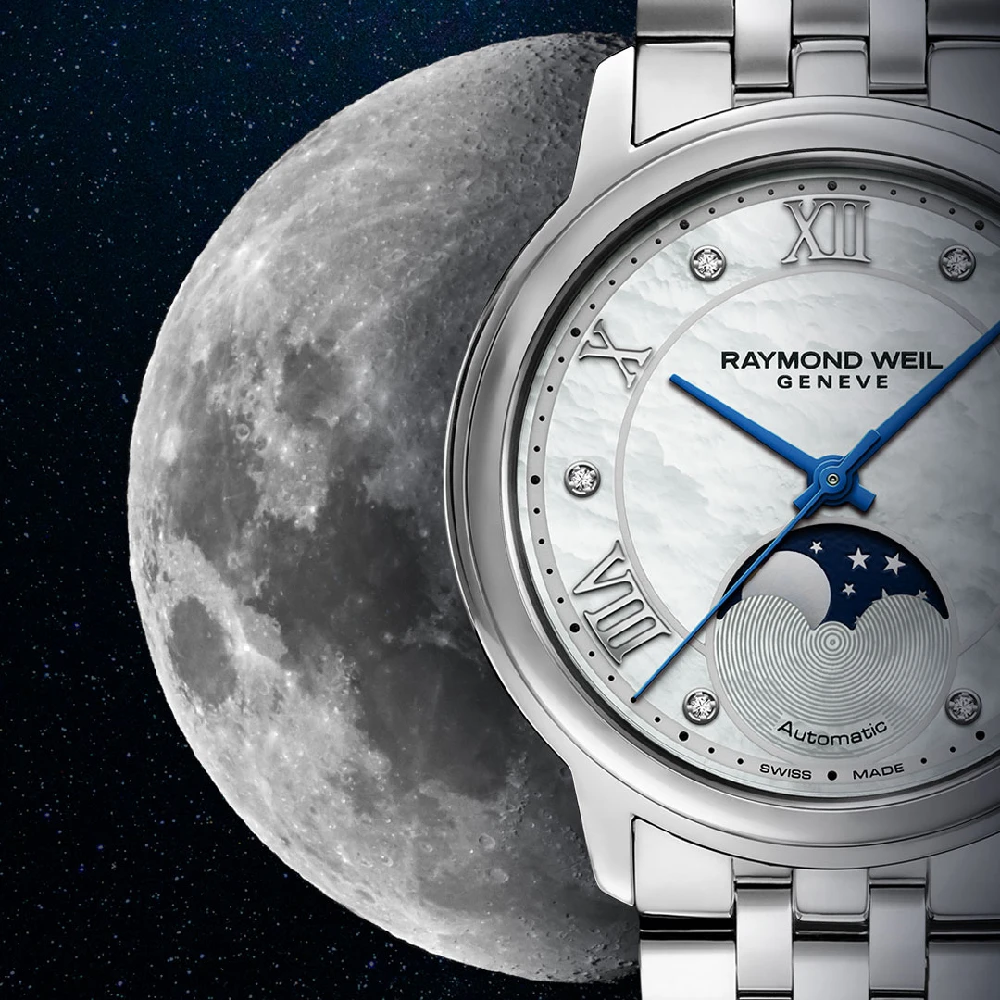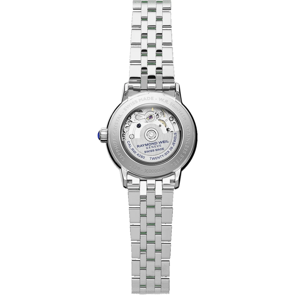 This Raymond Weil watch has a case made of stainless steel with a diameter of 34 mm and is fitted with a metal band. Inside the case lies a Sellita movement and the watch features a Sapphire crystal.
