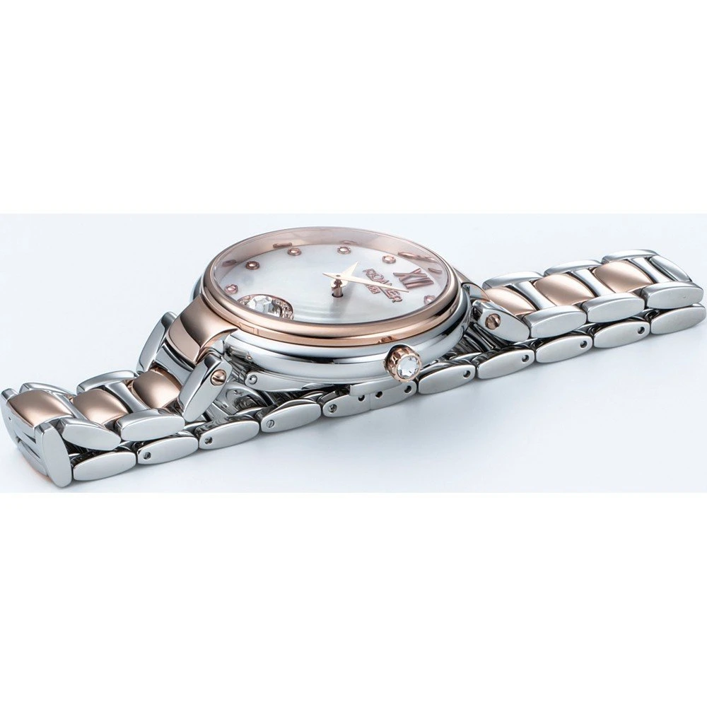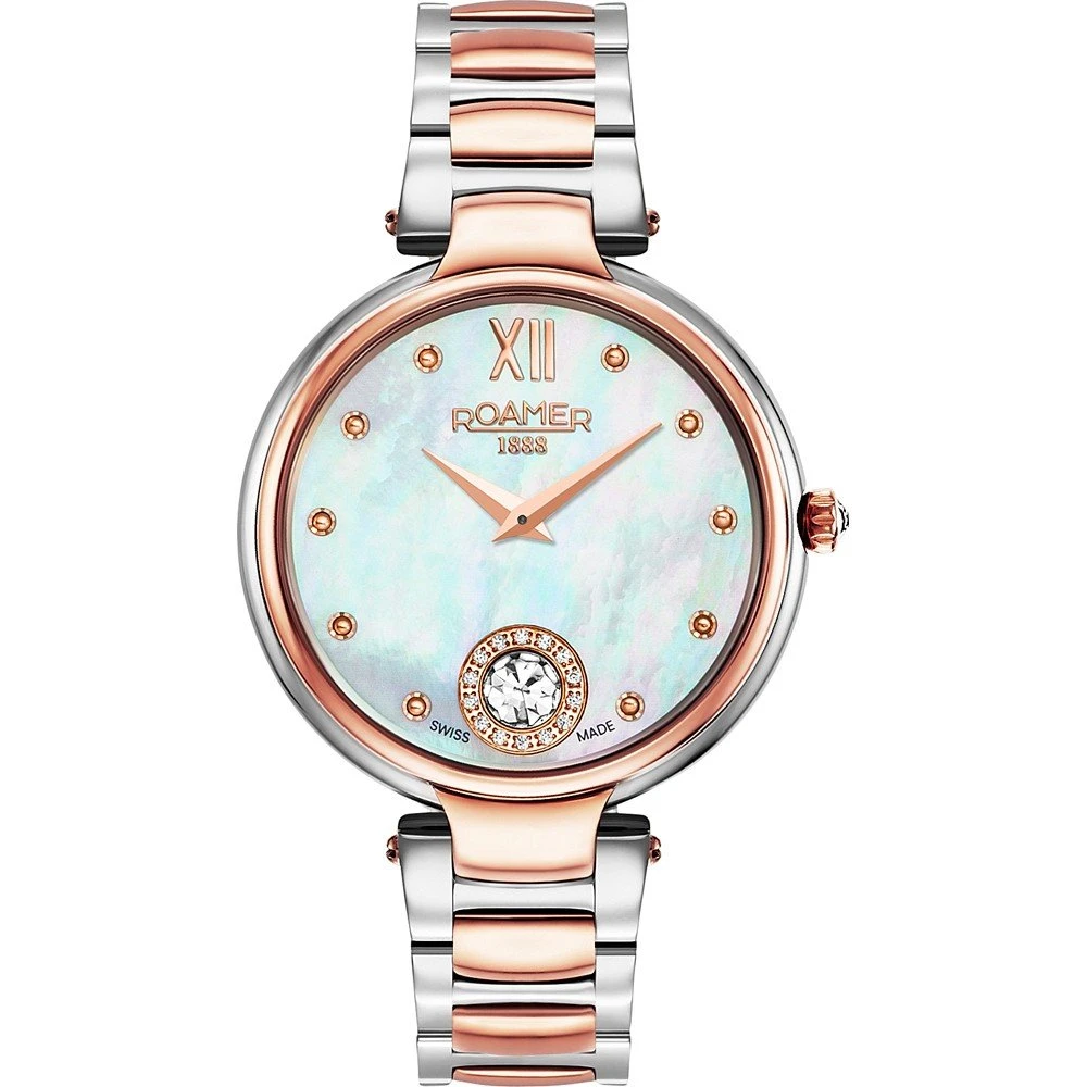 This Roamer watch has a case made of stainless steel with a diameter of 38 mm and is fitted with a metal band. Inside the case lies a Ronda movement and the watch features a Sapphire crystal.