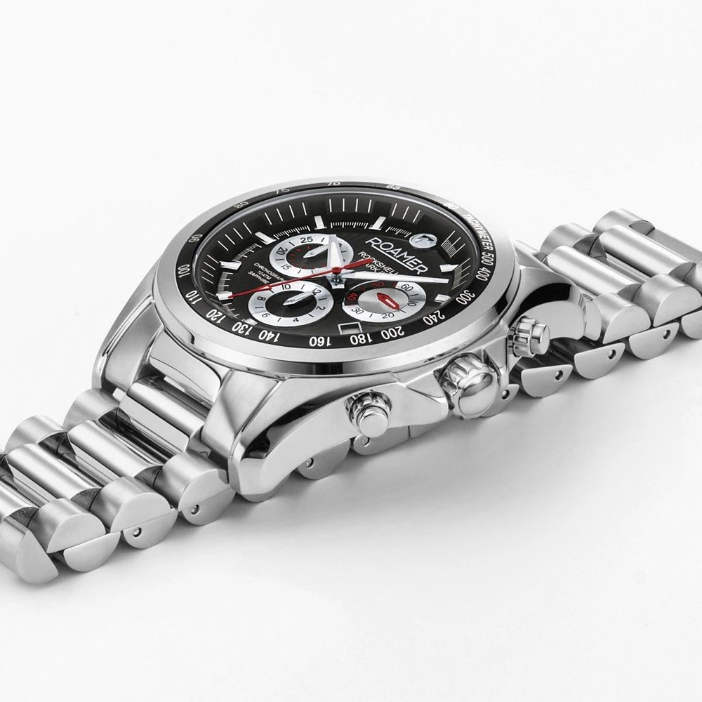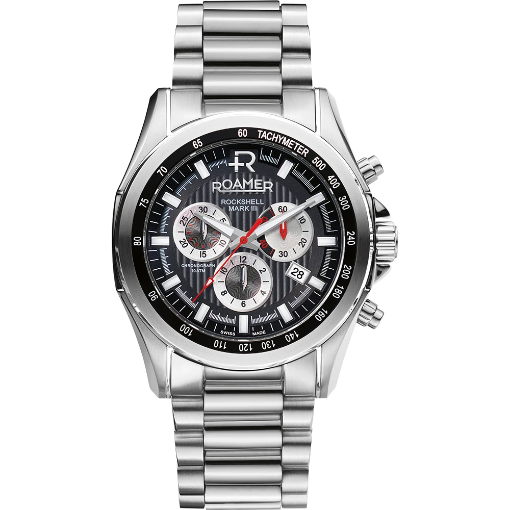 This Roamer watch has a case made of stainless steel with a diameter of 44 mm and is fitted with a metal band. Inside the case lies a Ronda movement and the watch features a Sapphire crystal.