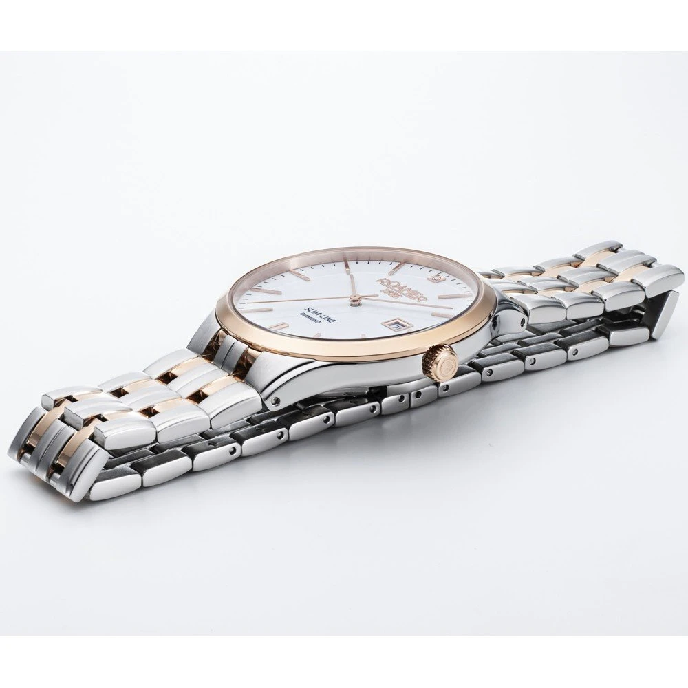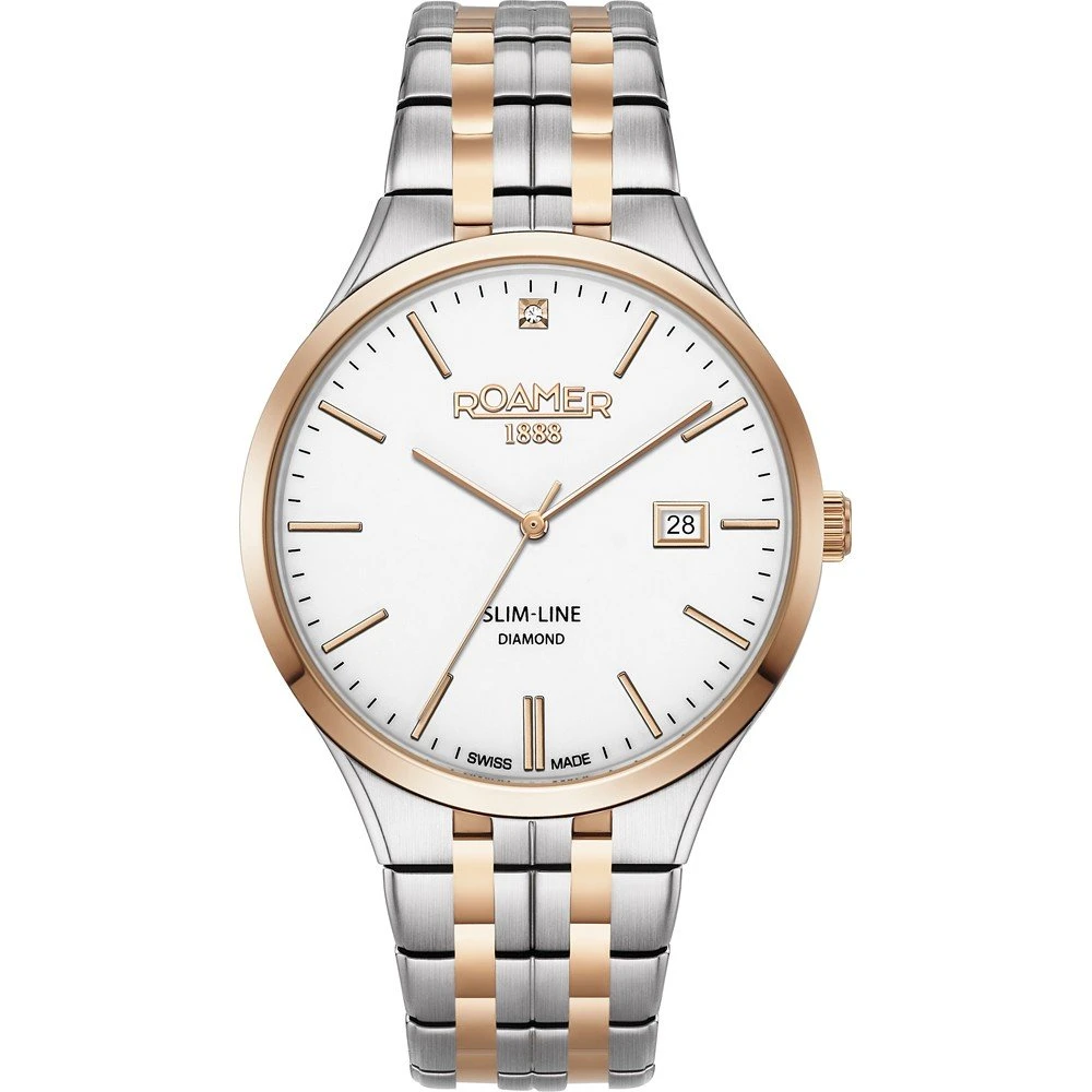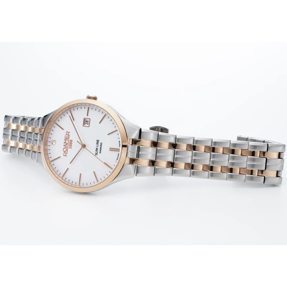 This Roamer watch has a case made of stainless steel with a diameter of 40 mm and is fitted with a metal band. Inside the case lies a Ronda movement and the watch features a Single anti-reflective sapphire crystal.