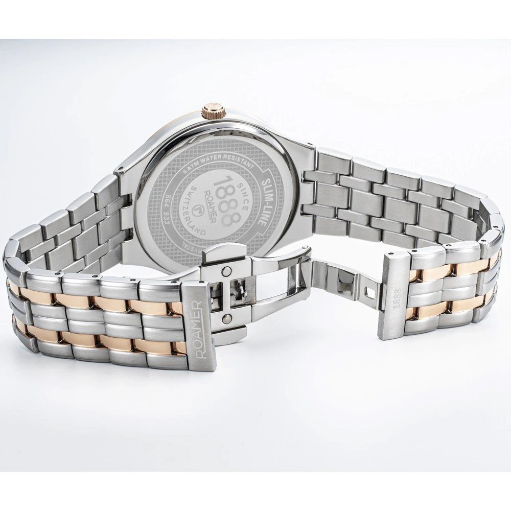 The watch is 5 ATM. This means the watch is suitable for showering. The watch comes with Roamer 2+5.