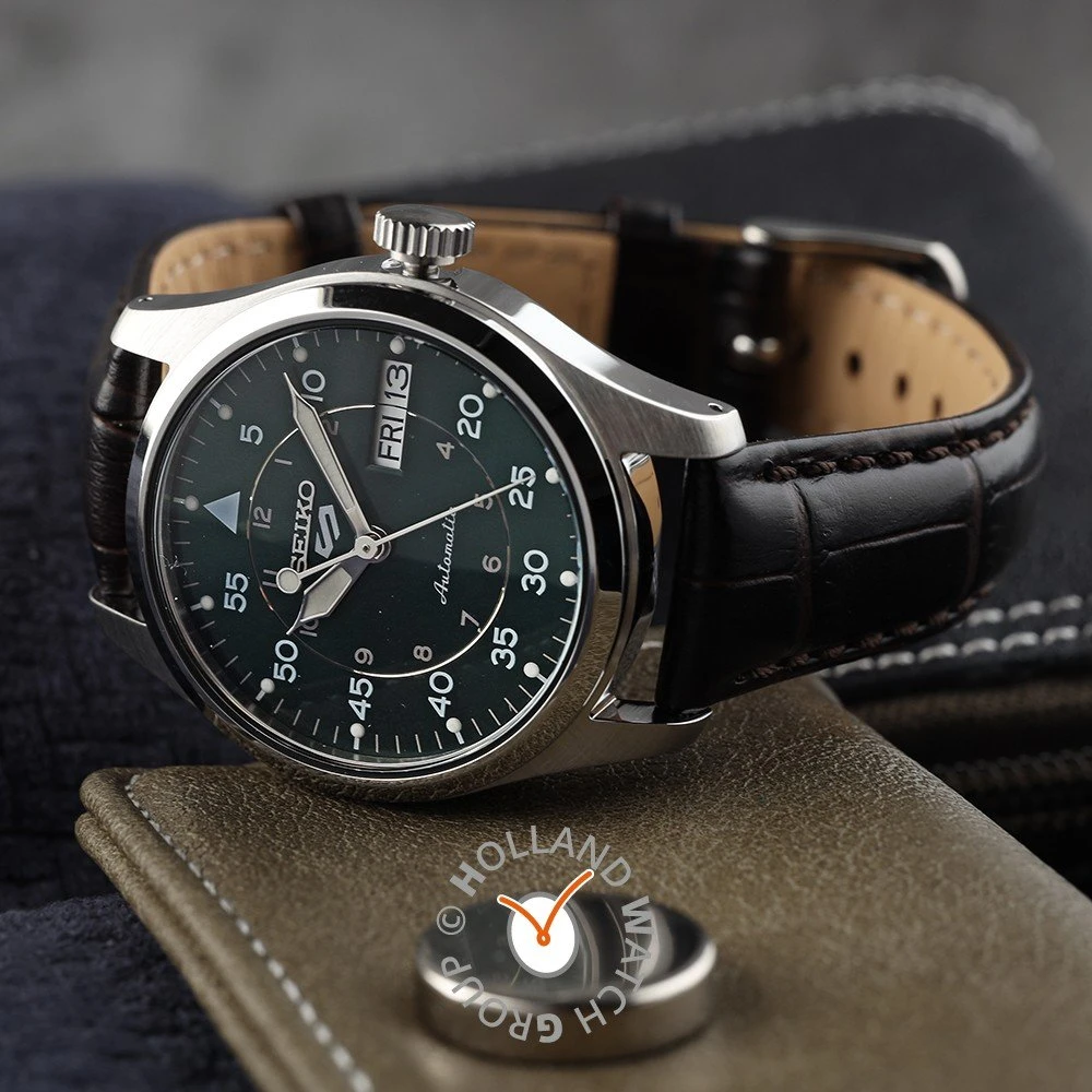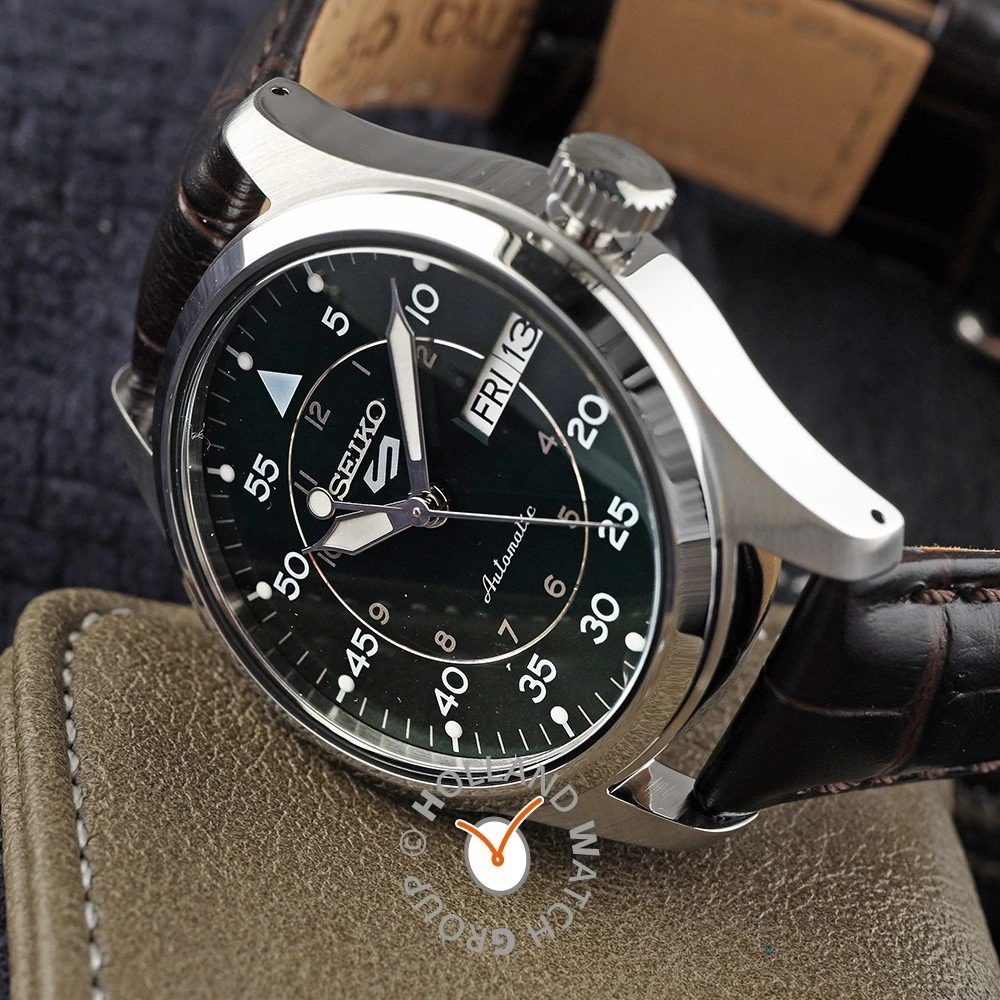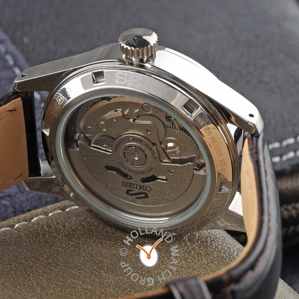 This Seiko watch has a case made of stainless steel with a diameter of 36 mm and is fitted with a leather band. Inside the case lies a Seiko movement and the watch features a Hardlex crystal crystal.
