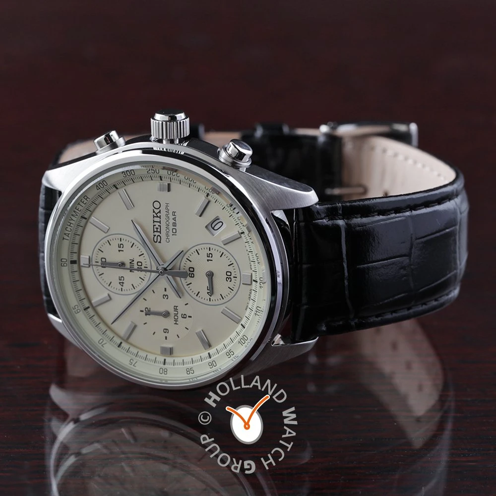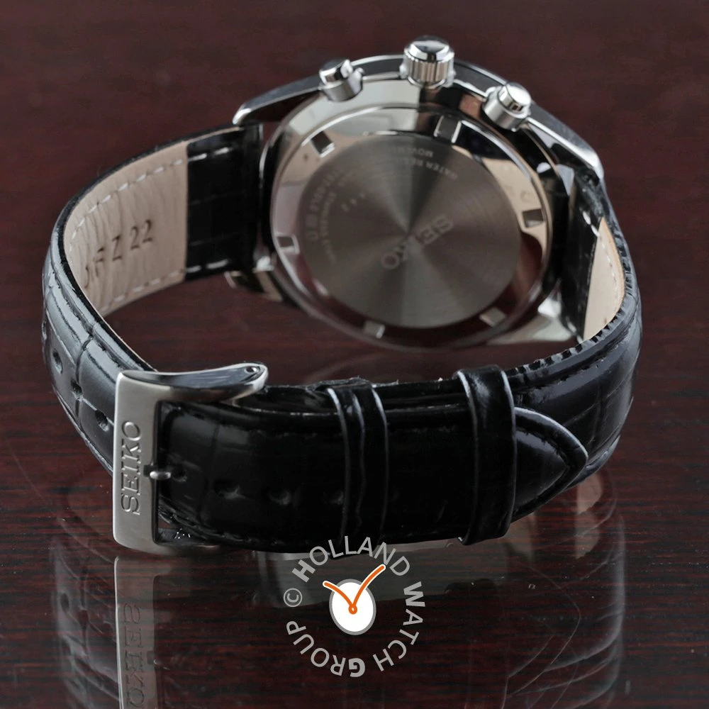 This Seiko watch has a case made of stainless steel with a diameter of 41.5 mm and is fitted with a leather band. Inside the case lies a Seiko movement and the watch features a Hardlex crystal crystal.