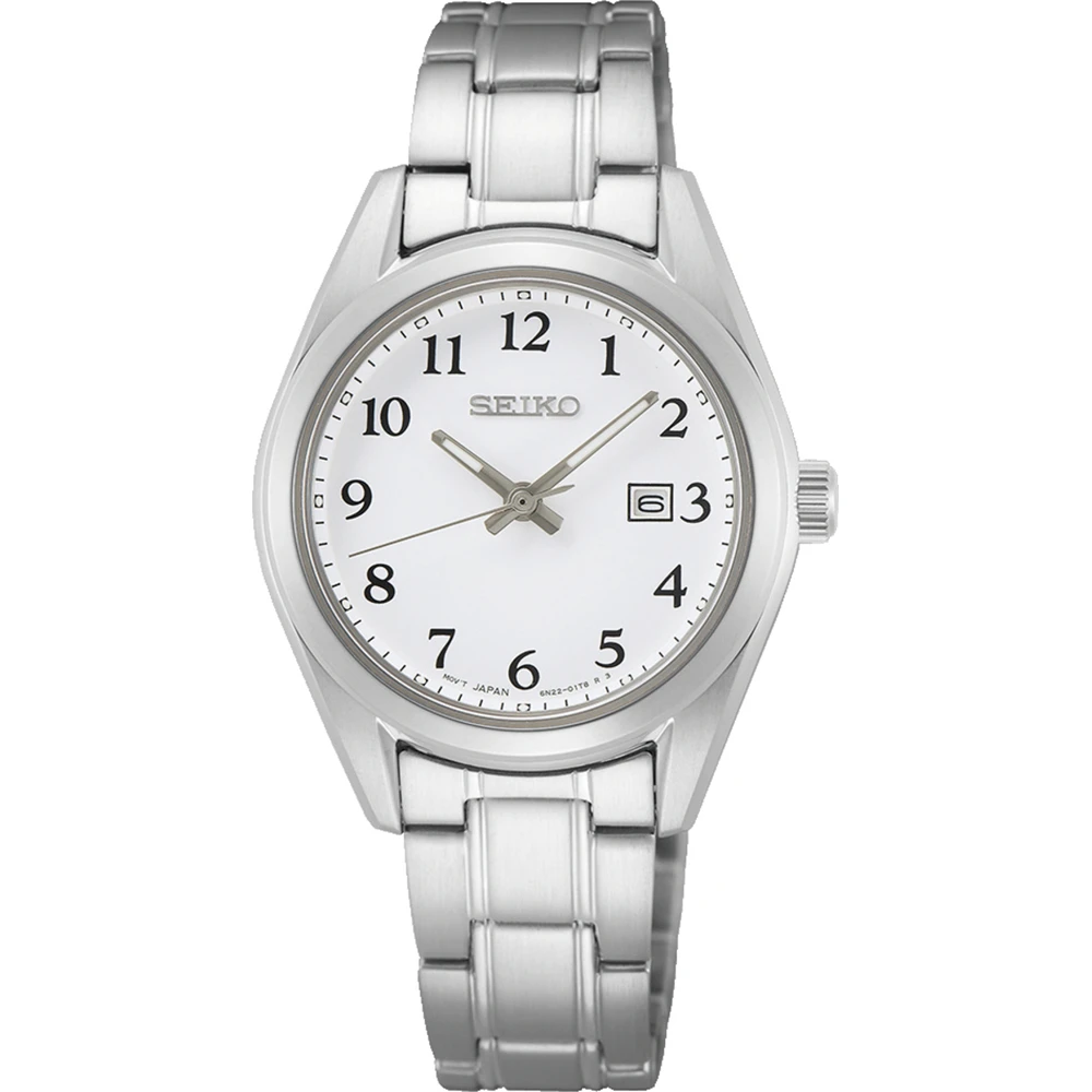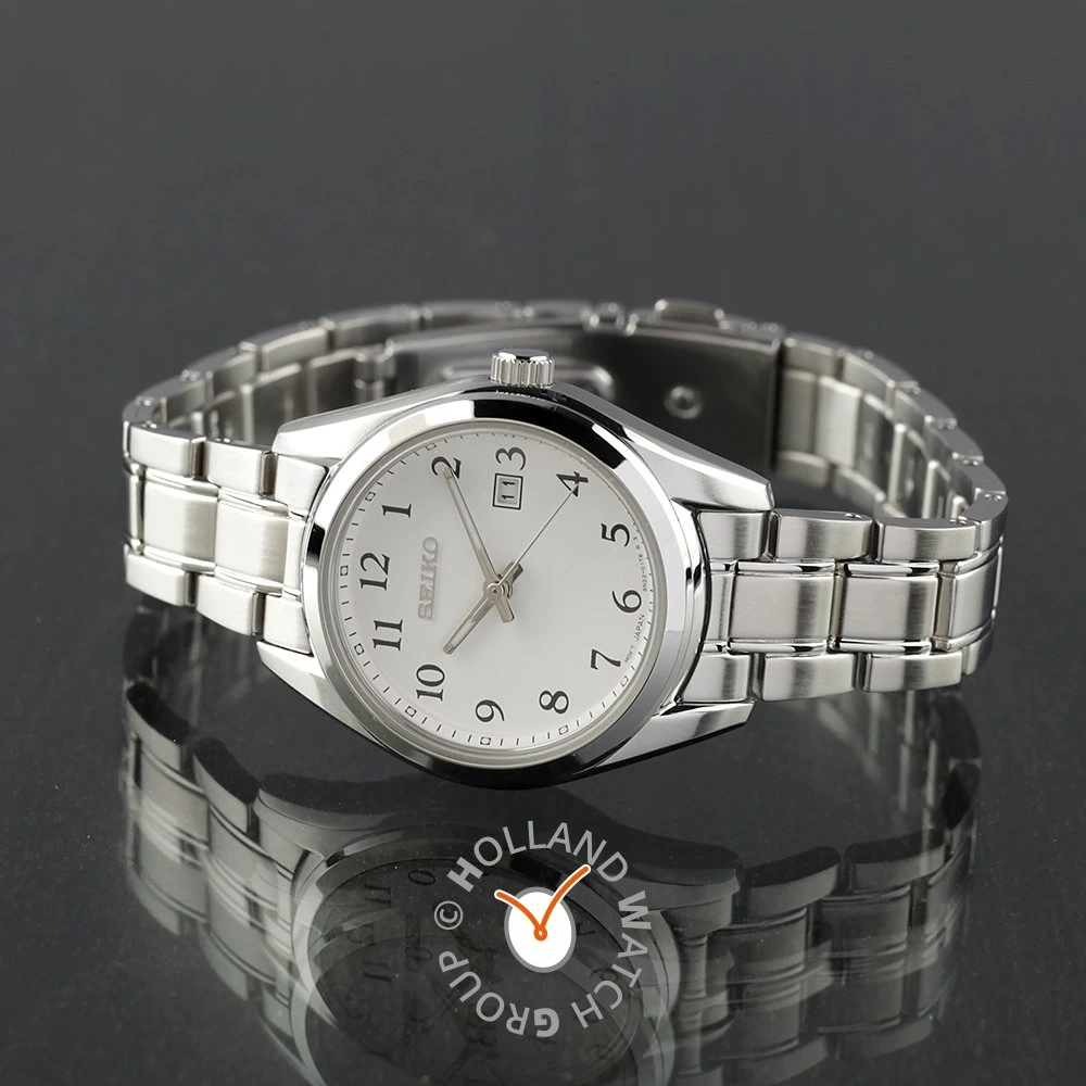 This Seiko watch has a case made of stainless steel with a diameter of 29 mm and is fitted with a metal band. Inside the case lies a Seiko movement and the watch features a Sapphire crystal.