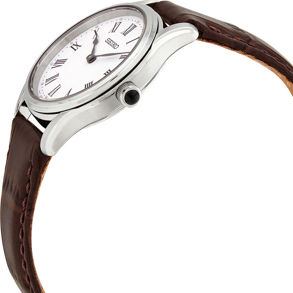 This Seiko watch has a case made of stainless steel with a diameter of 29 mm and is fitted with a leather band. Inside the case lies a Seiko movement and the watch features a Sapphire crystal.