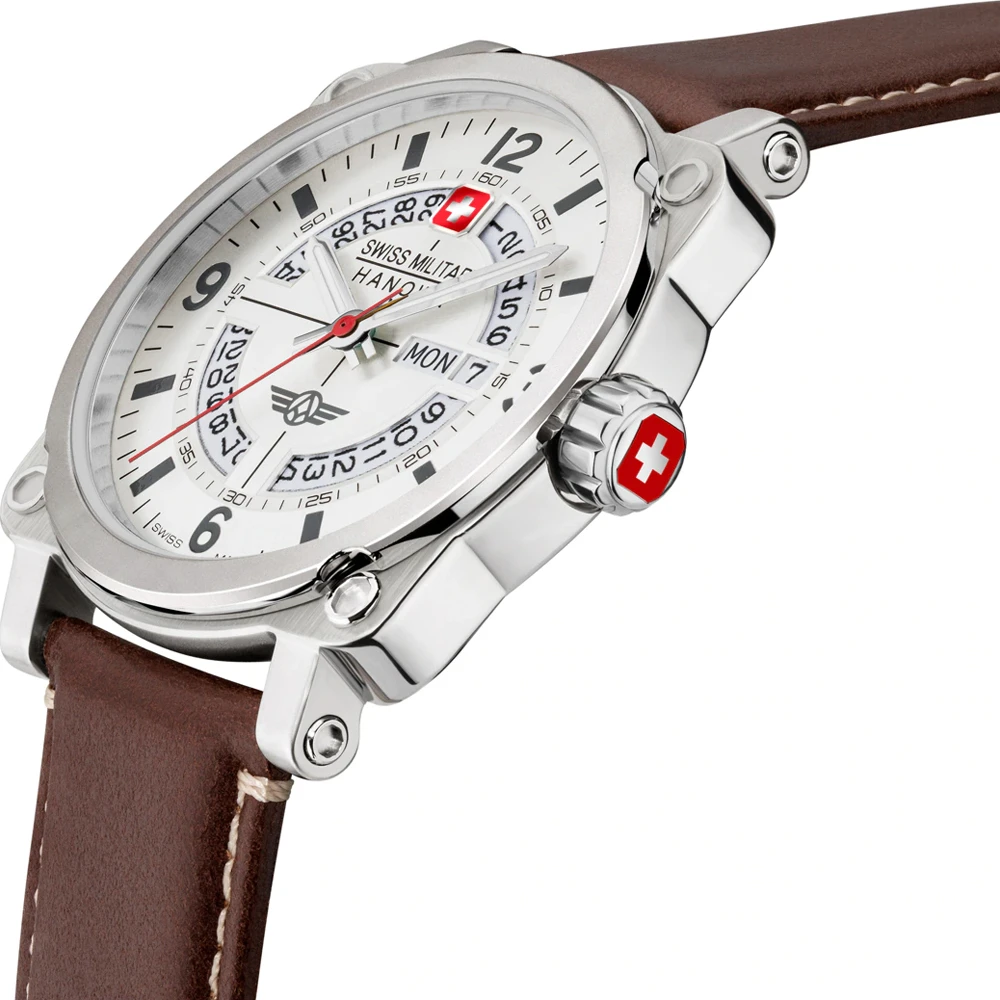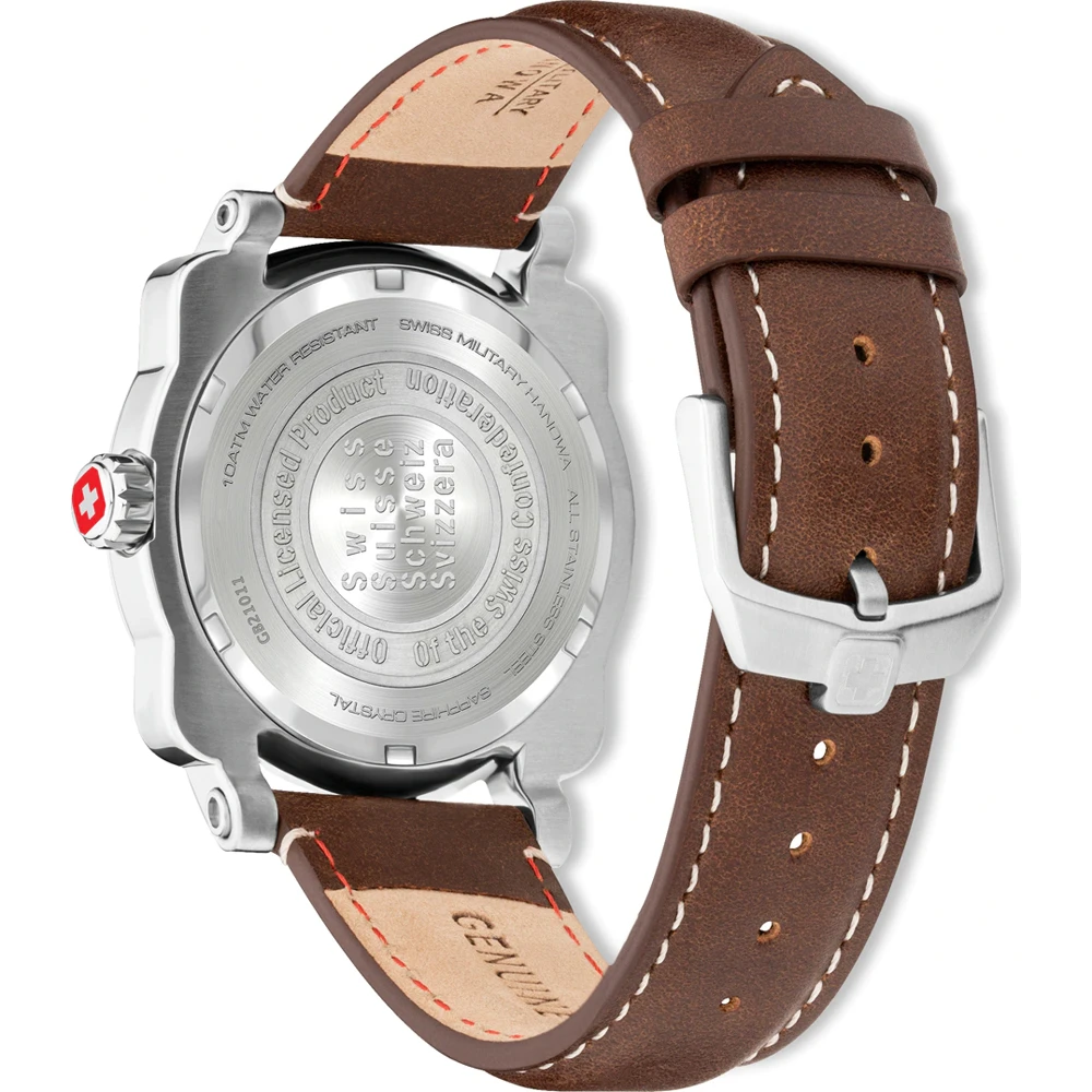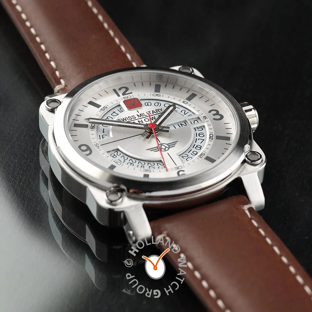 This Swiss Military Hanowa watch has a case made of stainless steel with a diameter of 43 mm and is fitted with a leather band. Inside the case lies a Ronda movement and the watch features a Sapphire crystal.
