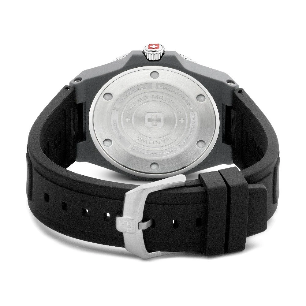 This Swiss Military Hanowa watch has a case made of Tide ocean plastic with a diameter of 45 mm and is fitted with a rubber band. Inside the case lies a Ronda movement and the watch features a Sapphire crystal.