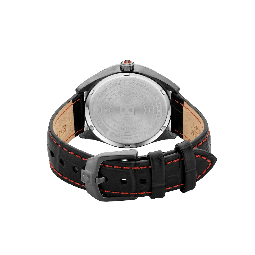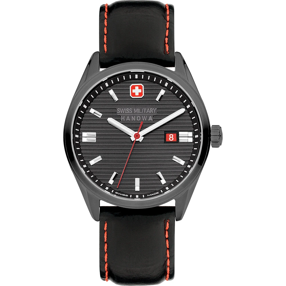This Swiss Military Hanowa watch has a case made of stainless steel with a diameter of 40 mm and is fitted with a leather band. Inside the case lies a Ronda movement and the watch features a Sapphire crystal.