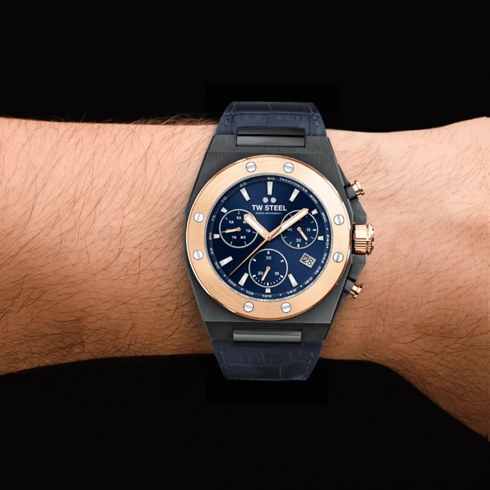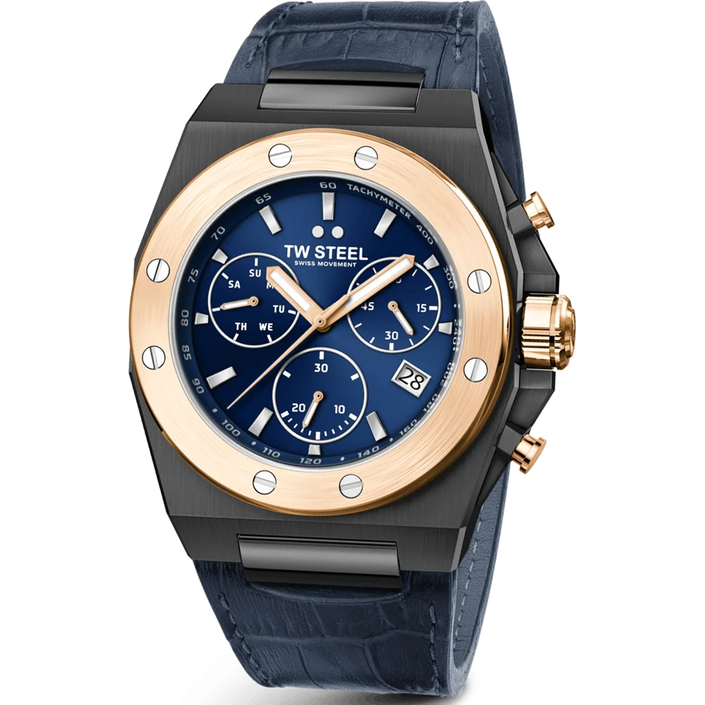 This TW Steel watch has a case made of stainless steel with a diameter of 45 mm and is fitted with a leather band. Inside the case lies a Ronda movement and the watch features a Single anti-reflective sapphire crystal.