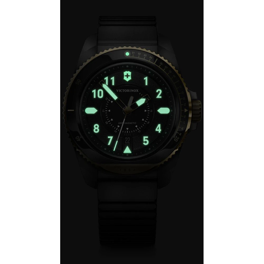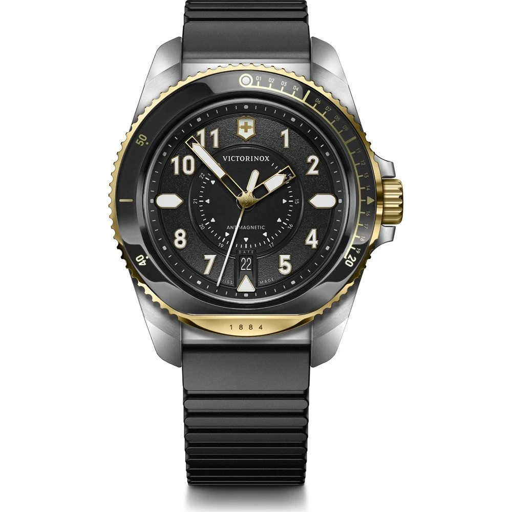 This Victorinox Swiss Army watch has a case made of stainless steel with a diameter of 43 mm and is fitted with a rubber band. Inside the case lies a Ronda movement and the watch features a Sapphire crystal.