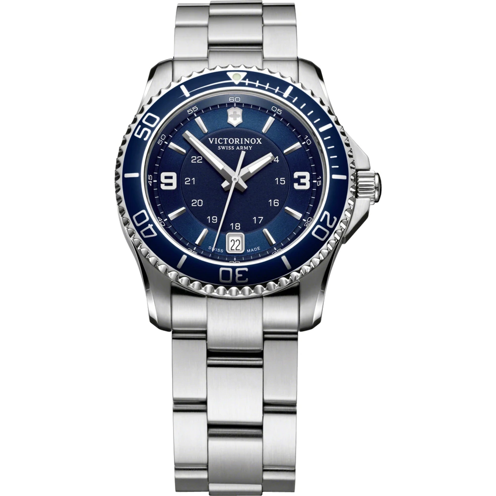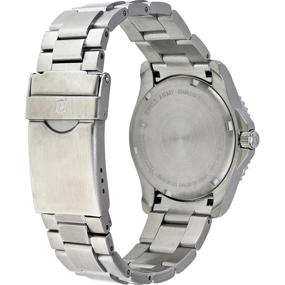 This Victorinox Swiss Army watch has a case made of stainless steel with a diameter of 34 mm and is fitted with a metal band. Inside the case lies a Ronda movement and the watch features a Sapphire crystal.